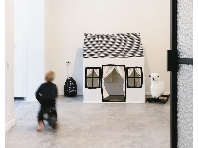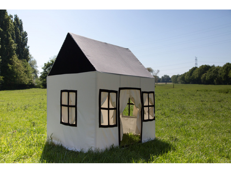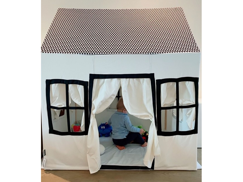 NA OBJEDNÁVKU S DODANÍM 4-6 TÝDNŮ Krásný hrací domek zajistí vašemu dítěti spoustu zábavy i prostor pro odpočinek. Domek tvoří pevná dřevěná konstrukce s textilními stěnami a střechou, okna a dveře jsou vybavené záclonkami. Rozměry: 125 x 95 x 145 cm Složení: dřevo borovice, plátno 100% bavlna, záclonky 100% polyester.