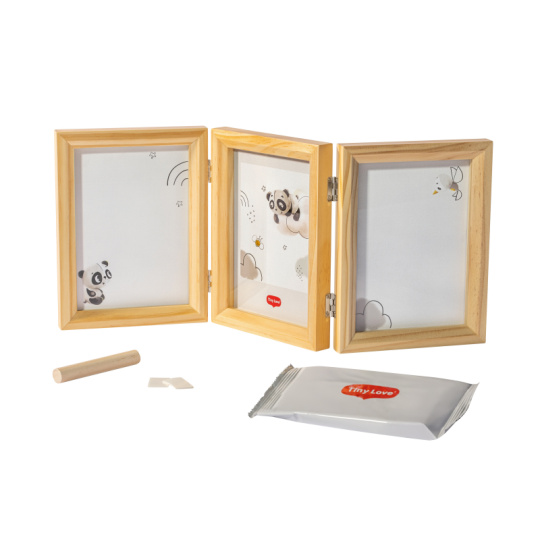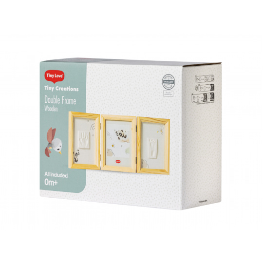 Dřevěný rámeček Tiny Creations Double Frame nabízí tři oddělené prostory pro fotografii a otisk ručičky a nožičky Vašeho miminka. Vyrobte si krásnou dekoraci, která vám zároveň pomůže uchovat vzpomínky na krásné období po narození vašeho dítěte. Použití dle přiloženého návodu je jednoduché, rychlé a bez nepořádku. Balení obsahuje rámeček a vše, co potřebujete k výrobě otisku. Výrobek je dermatologicky testován a je pro vaše dítě 100% zdravotně nezávadný.