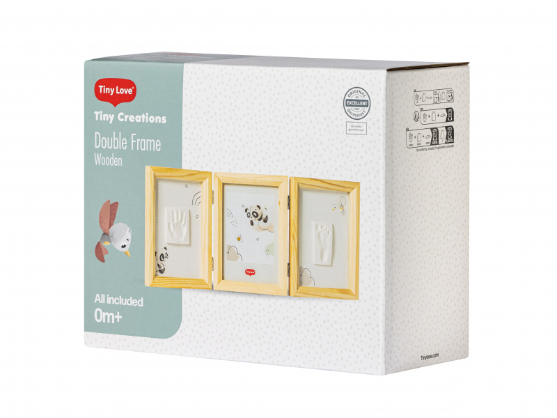 Dřevěný rámeček Tiny Creations Double Frame nabízí tři oddělené prostory pro fotografii a otisk ručičky a nožičky Vašeho miminka. Vyrobte si krásnou dekoraci, která vám zároveň pomůže uchovat vzpomínky na krásné období po narození vašeho dítěte. Použití dle přiloženého návodu je jednoduché, rychlé a bez nepořádku. Balení obsahuje rámeček a vše, co potřebujete k výrobě otisku. Výrobek je dermatologicky testován a je pro vaše dítě 100% zdravotně nezávadný.