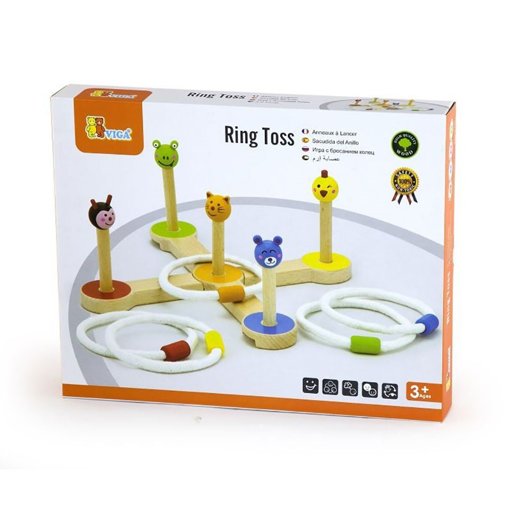 Rozkládací hra na házení kroužků. Dva způsoby spojení dvou základních desek pro větší zábavu při společné hře. Obsahuje 2 základní desky, 5 kolíků s různými roztomilými zvířátky a 5 kroužků s korálky v různých barvách.