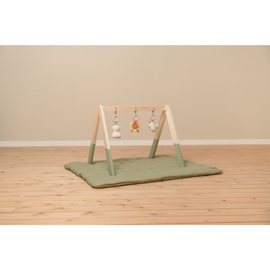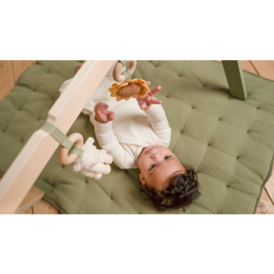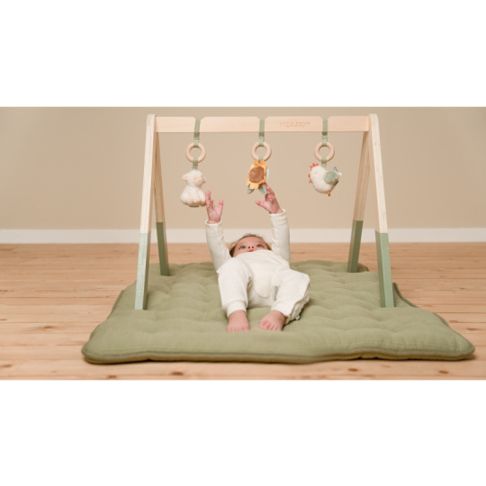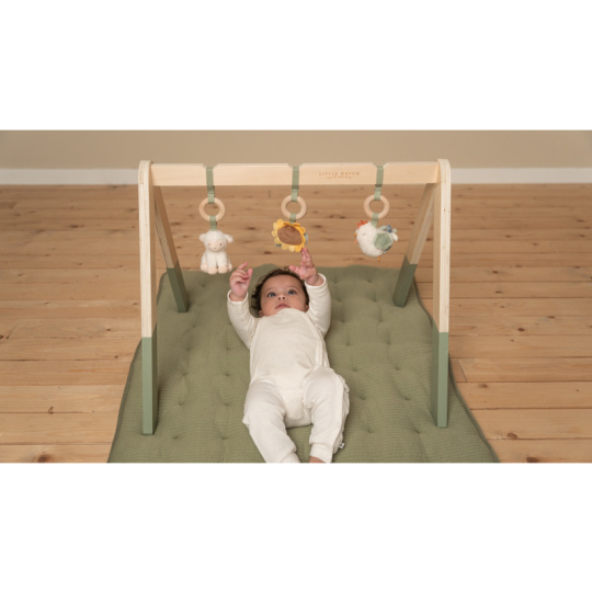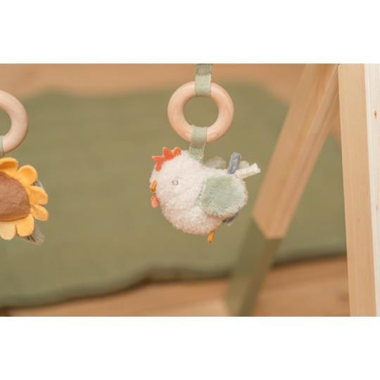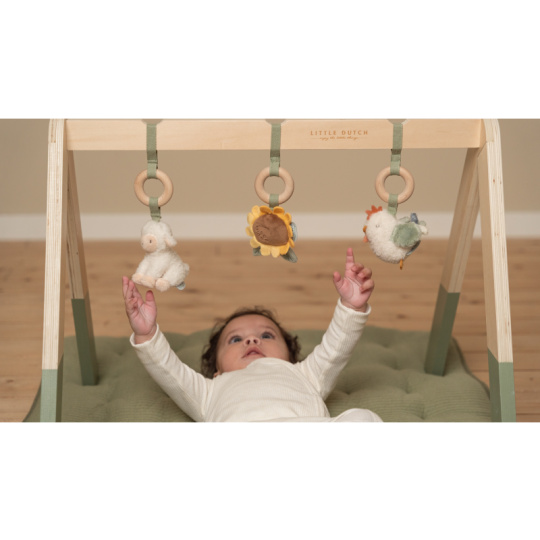 Stylová dřevěná hrazdička se třemi zavěšenými plyšovými hračkami v podobě ovečky, slunečnice a ptáčka poskytne vašemu miminku spoustu zábavy při hraní na dece. Jednotlivé hračky lákají dítě ke zkoumání a dotýkání, při pohybu chrastí a šustí. Hrazda je vyrobena z vysoce kvalitního odolného dřeva. Odnímatelné hračky je možné používat i samostatně. Hrazda je součástí designové kolekce hraček Little Dutch Farma. Rozměry: 48 x 60 x 54 cm Vhodné pro děti od narození.