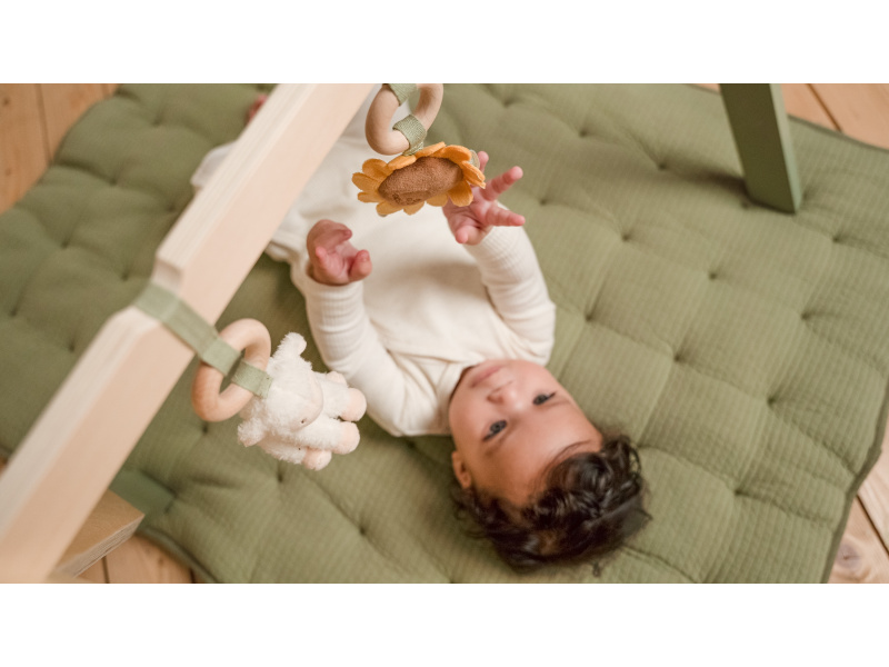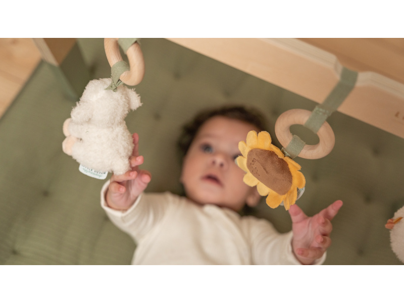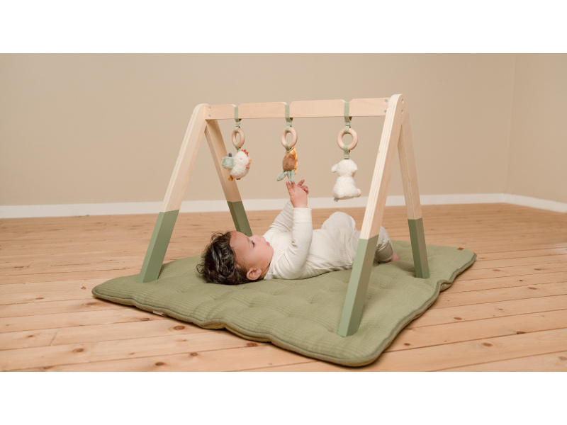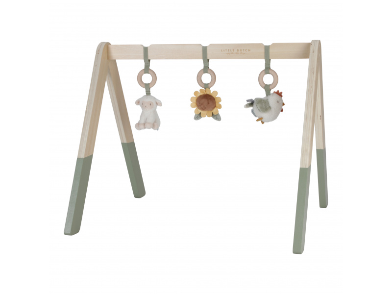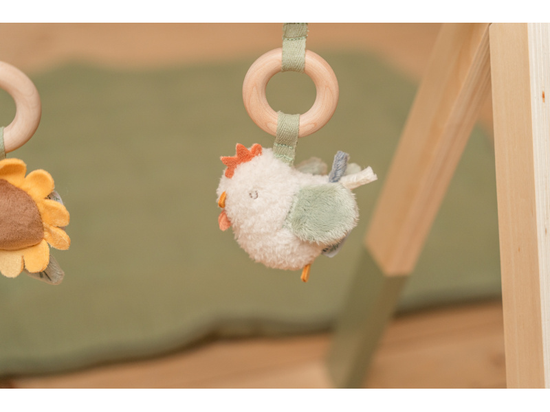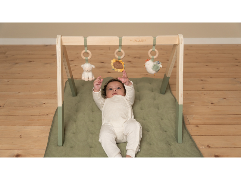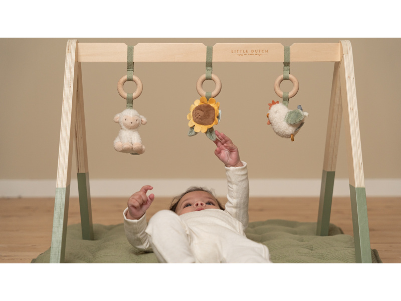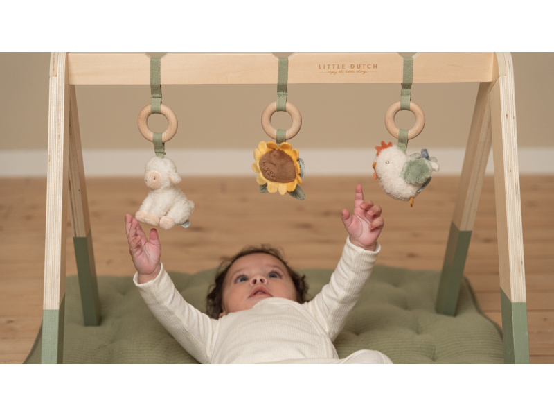 Stylová dřevěná hrazdička se třemi zavěšenými plyšovými hračkami v podobě ovečky, slunečnice a ptáčka poskytne vašemu miminku spoustu zábavy při hraní na dece. Jednotlivé hračky lákají dítě ke zkoumání a dotýkání, při pohybu chrastí a šustí. Hrazda je vyrobena z vysoce kvalitního odolného dřeva. Odnímatelné hračky je možné používat i samostatně. Hrazda je součástí designové kolekce hraček Little Dutch Farma. Rozměry: 48 x 60 x 54 cm Vhodné pro děti od narození.