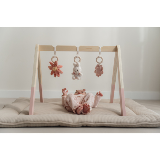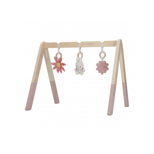 Stylová dřevěná hrazdička se třemi zavěšenými plyšovými hračkami v podobě králíčka Miffy, kytičky a lístku poskytne vašemu miminku spoustu zábavy při hraní na dece. Jednotlivé hračky lákají dítě ke zkoumání a dotýkání, při pohybu chrastí a šustí. Odnímatelné hračky je možné používat i samostatně. Hrazda je je součástí kolekce hraček Little Dutch Miffy, jejichž ústřední postavou je roztomilá králičí holčička Miffy, známá z knížek pro děti holandského spisovatele Dicka Bruny. Vyrobeno z vysoce kvalitního odolného dřeva certifikovaného FSC. Rozměry: 48 x 60 x 54 cm Vhodné pro děti od narození.