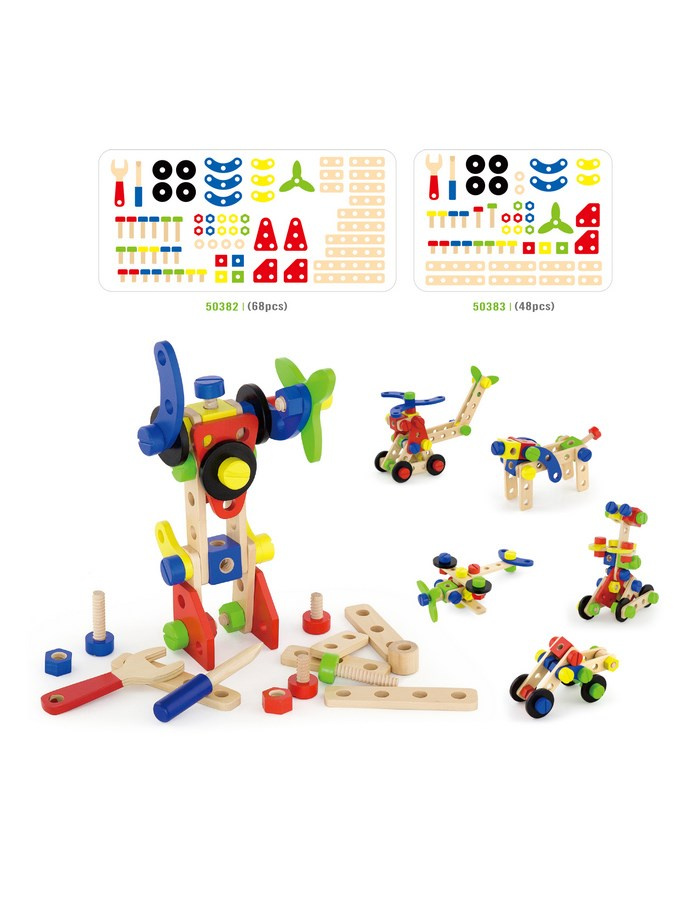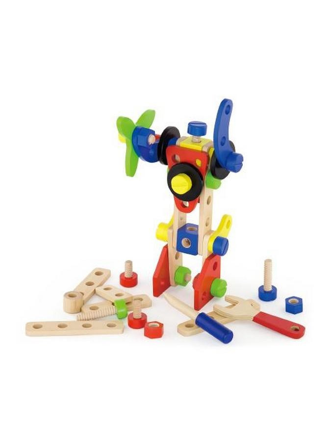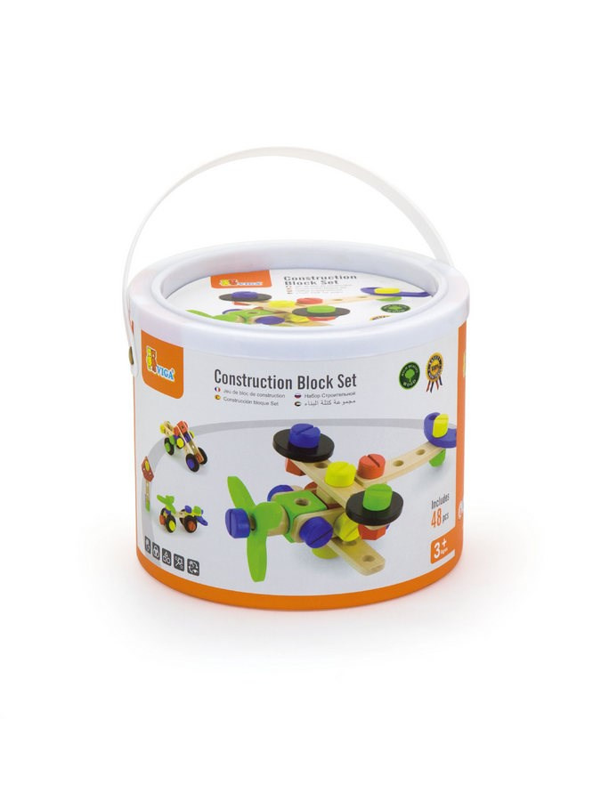 Dřevěná konstrukční stavebnice Viga. Sada obsahuje 48 dílků, ze kterých můžete postavit letadlo, robota, auto a mnoho dalších věcí. Stavebnice je v plastovém kyblíku s rukojetí. Sada obsahuje také brožuru, která inspiruje vaše dítě k tvůrčí zábavě. Hračka je vyrobena z lakovaného dřeva. Naší prioritou je bezpečnost a kvalita našich výrobků, a proto barvy použité na hračkách nejsou toxické a splňují bezpečnostní standardy (EN71 a ASTM). Pro děti od 3 let.