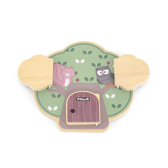 Představujeme dřevěnou manipulační desku ve tvaru stromu, která skvěle rozvíjí smyslové a logické myšlení dětí. Na dřevěné desce jsou 3 dvířka a za každými dvířky je jiné zvířátko: veverka, sova a ježek, který na zádech nosí jablka.
