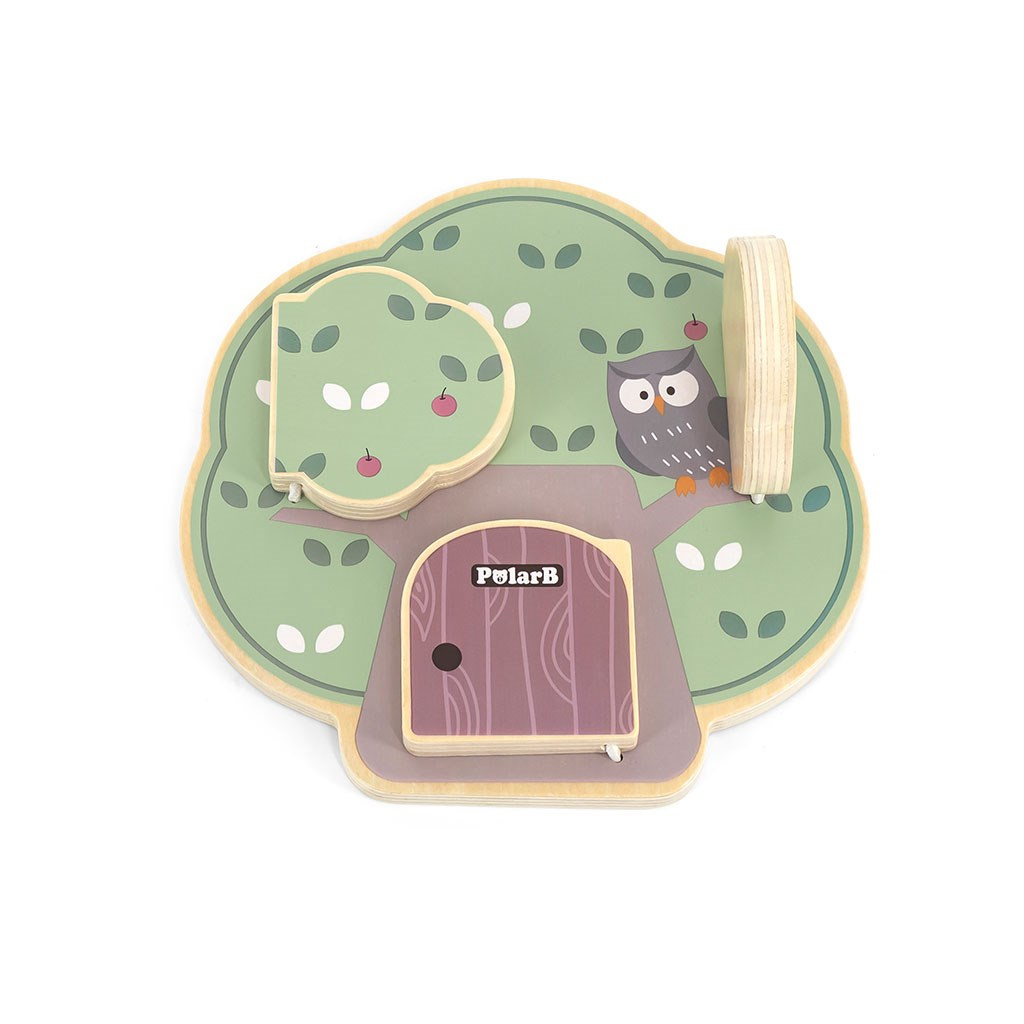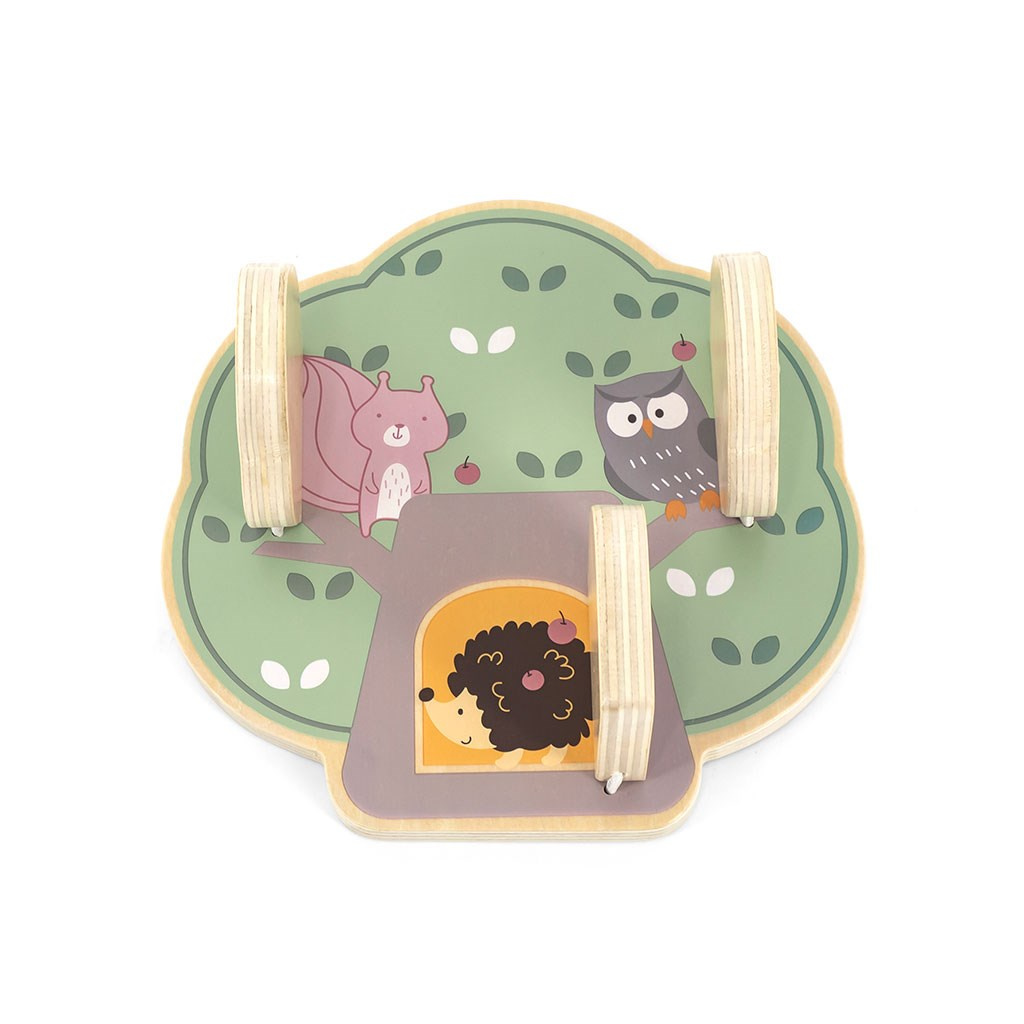 Představujeme dřevěnou manipulační desku ve tvaru stromu, která skvěle rozvíjí smyslové a logické myšlení dětí. Na dřevěné desce jsou 3 dvířka a za každými dvířky je jiné zvířátko: veverka, sova a ježek, který na zádech nosí jablka.