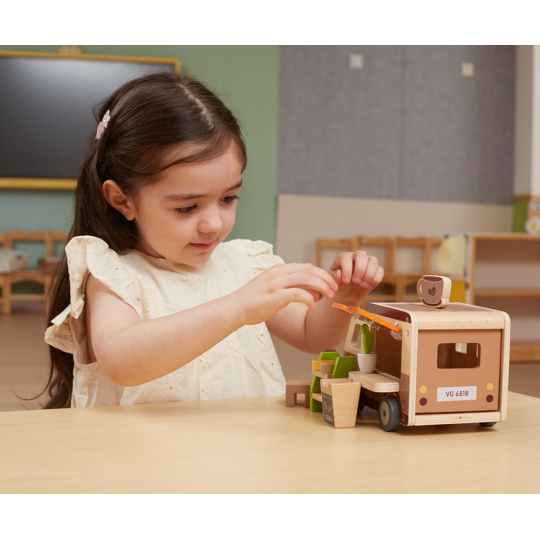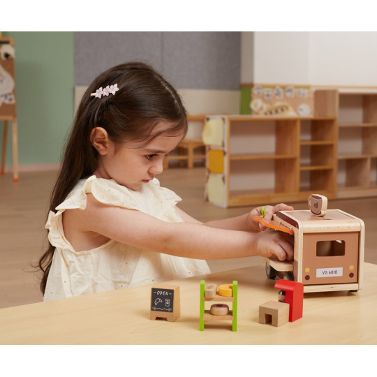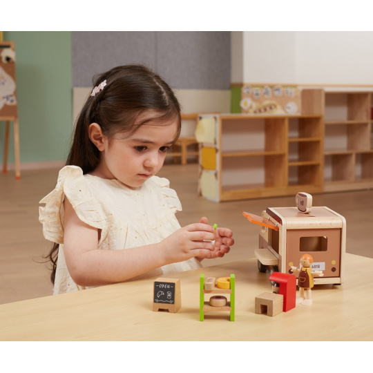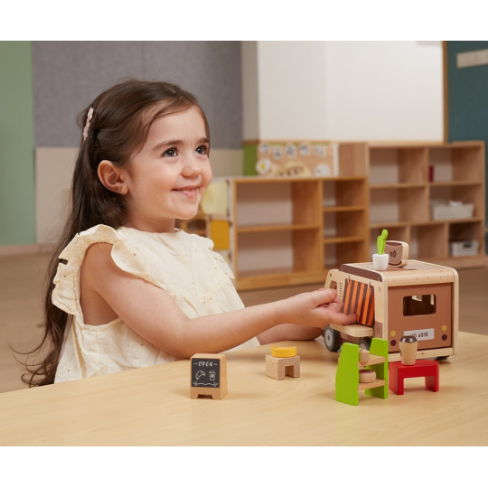 Pevná dřevěná konstrukce a jemné pastelové barvy nanesené netoxickými barvami činí hračku nejen esteticky příjemnou, ale i bezpečnou pro nejmenší. Sada je navržena s ohledem na rozvoj představivosti, manuálních dovedností a sociálních schopností dětí a nabízí mnoho hodin kreativní zábavy. Perfektní pro děti, které milují dobrodružství a sní o vlastní mobilní kavárně na kolech.