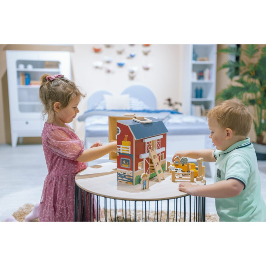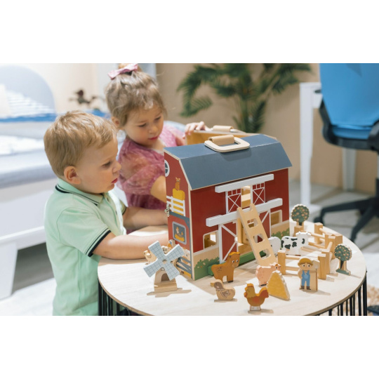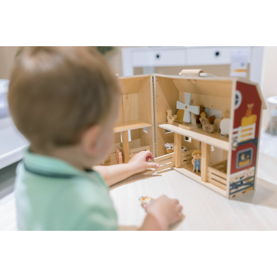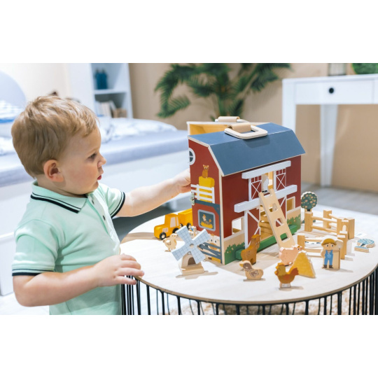 Figurky zvířátek jsou součástí a poskytují nekonečné možnosti příběhů z farmy. Tato hračka podporuje rozvoj představivosti a zároveň rozvíjí koordinaci ruka-oko díky manipulaci s figurkami a otevírání dveří.
