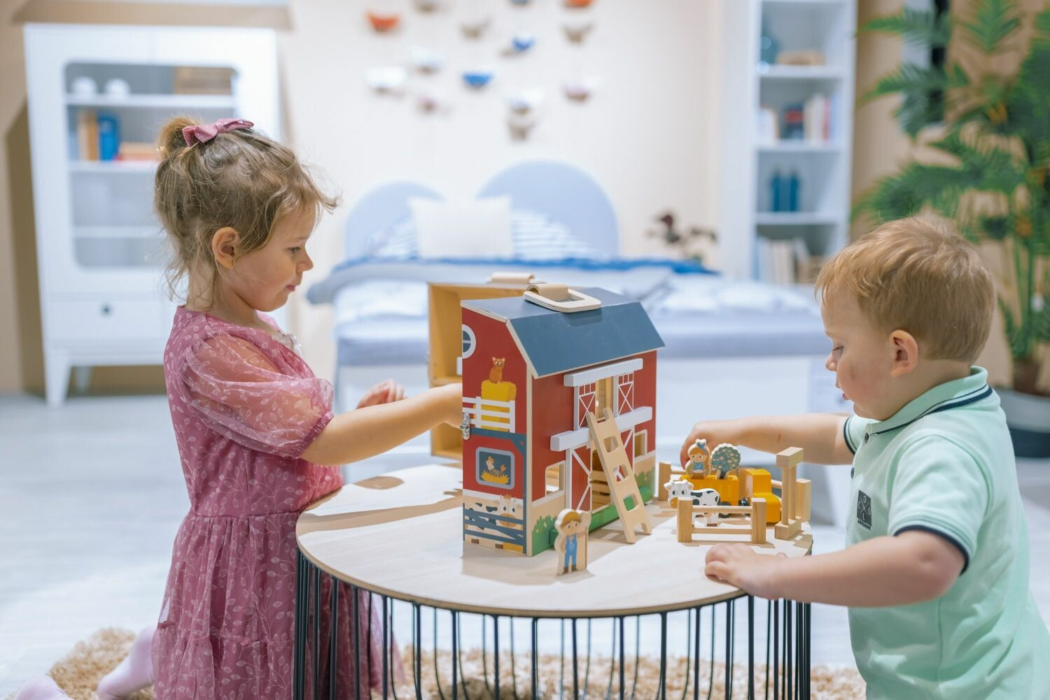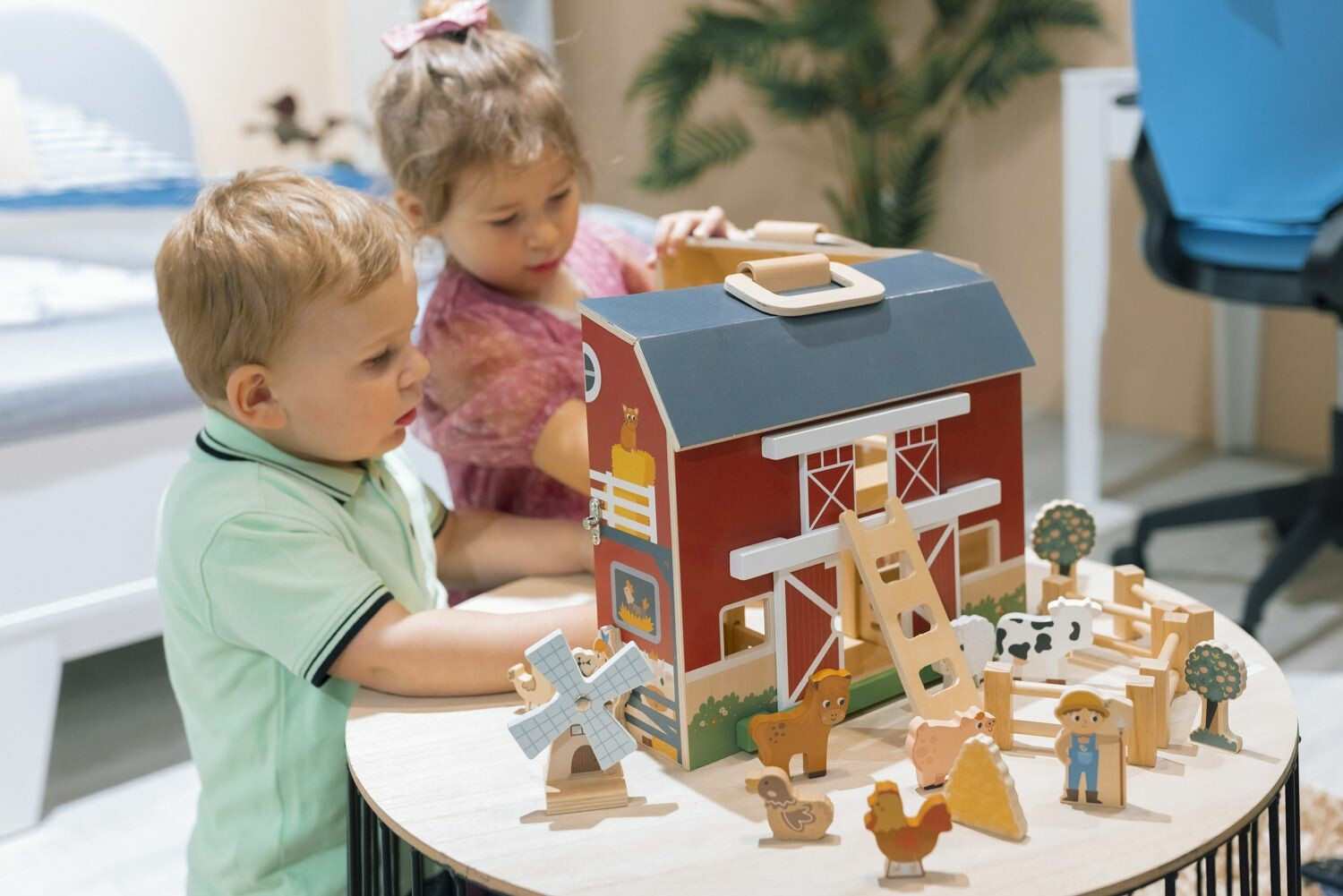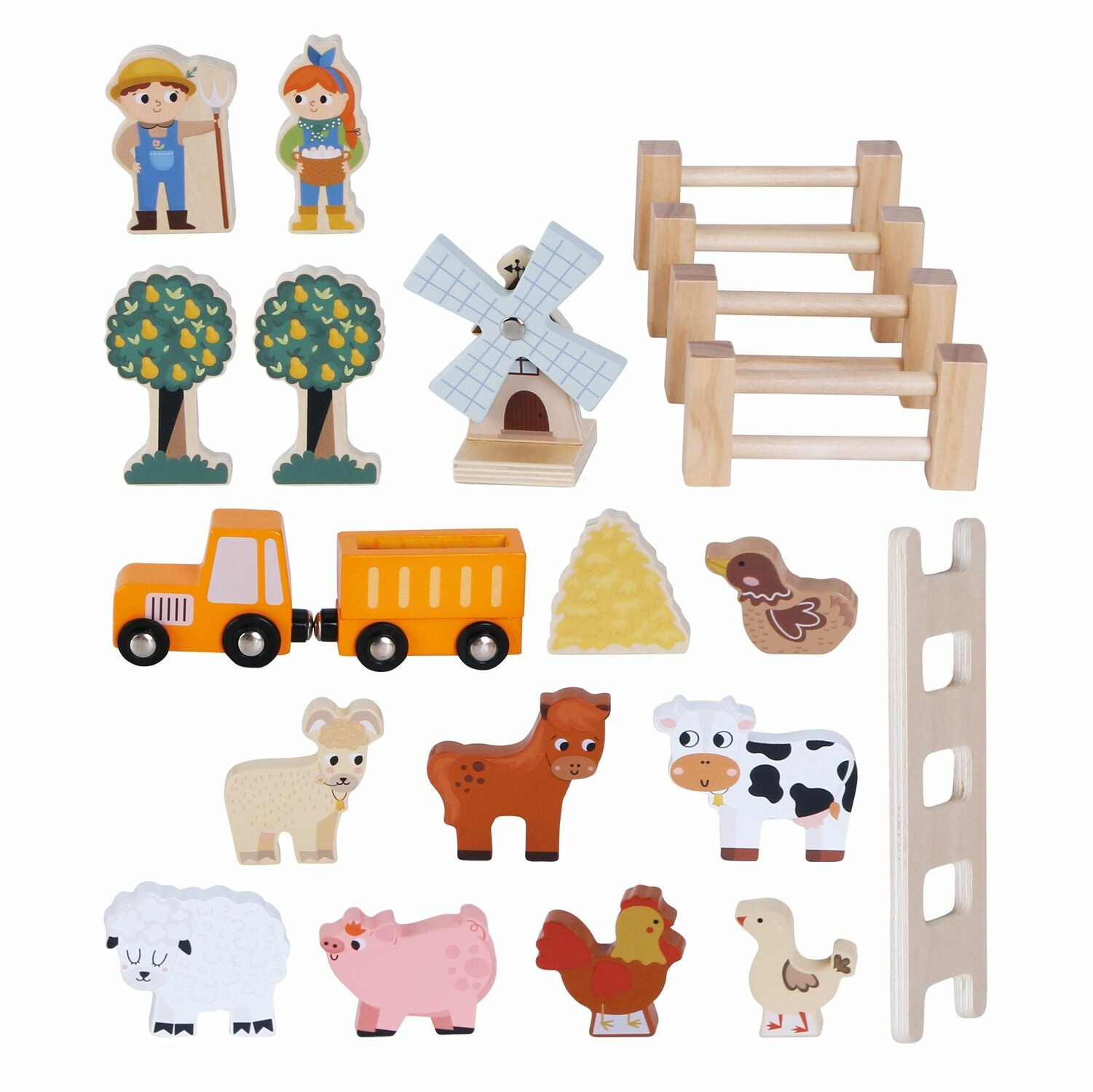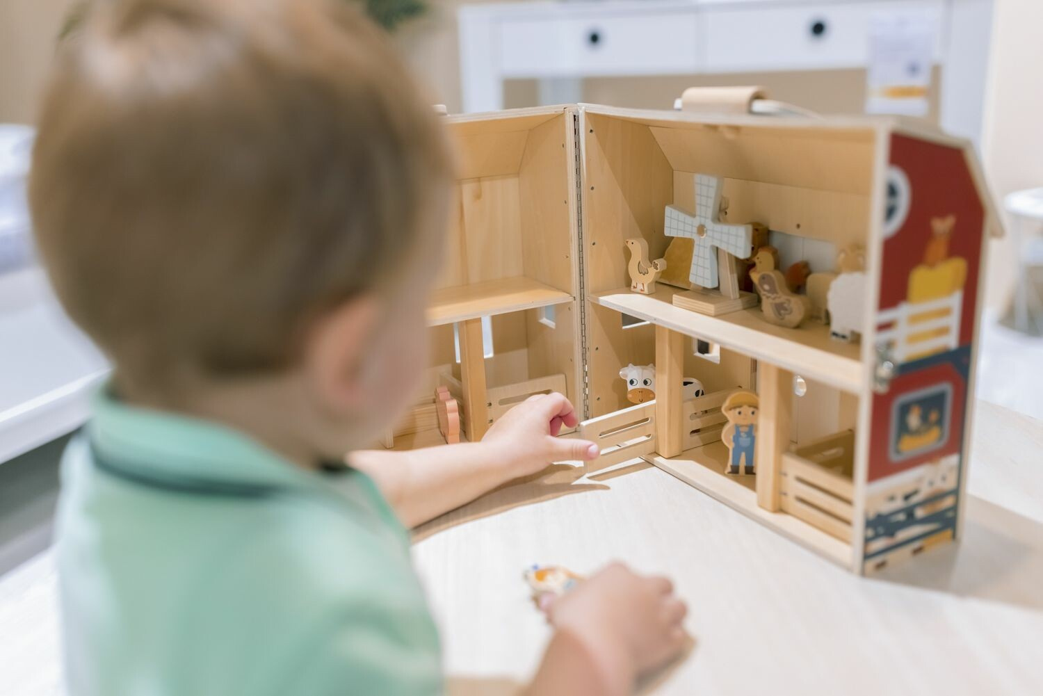 Figurky zvířátek jsou součástí a poskytují nekonečné možnosti příběhů z farmy. Tato hračka podporuje rozvoj představivosti a zároveň rozvíjí koordinaci ruka-oko díky manipulaci s figurkami a otevírání dveří.