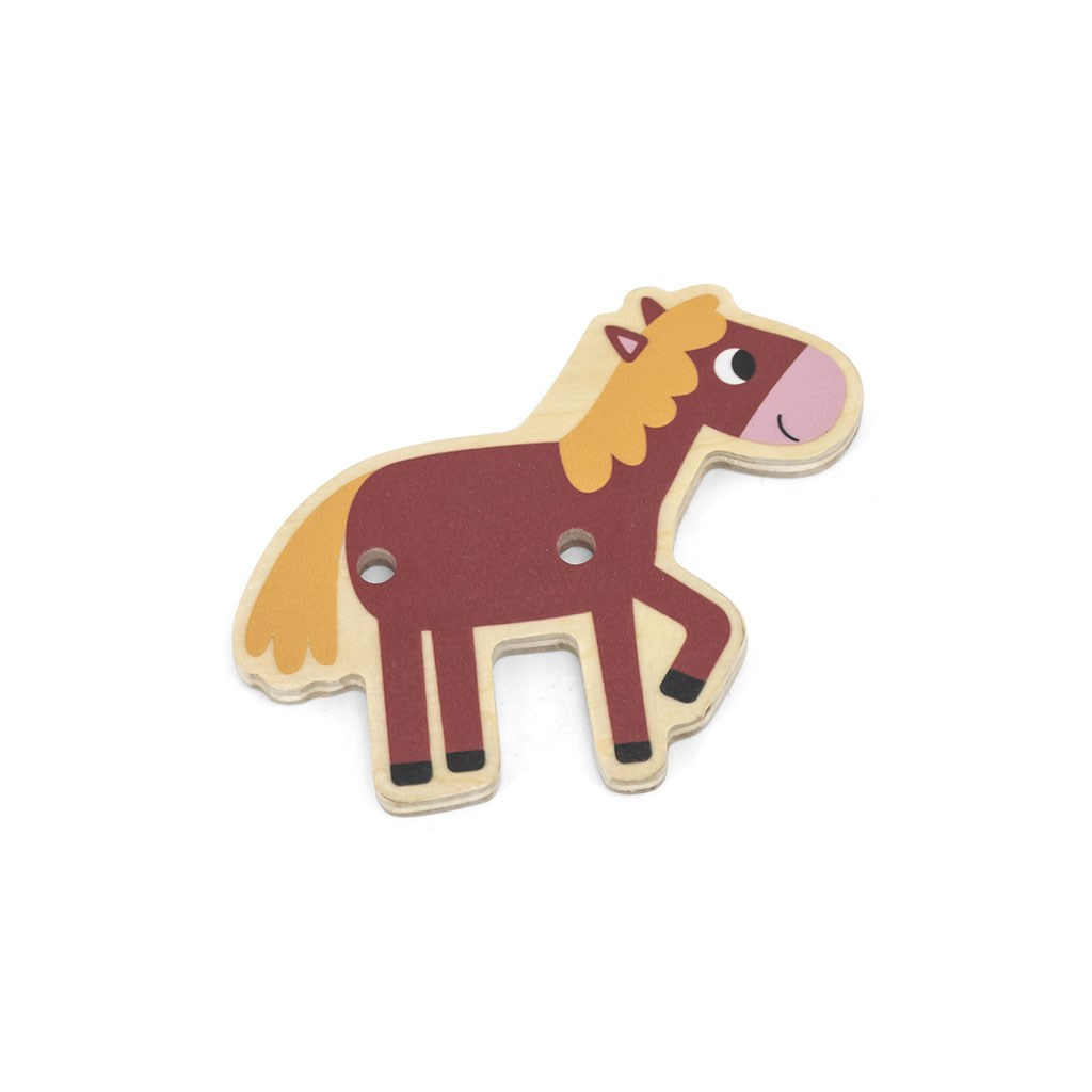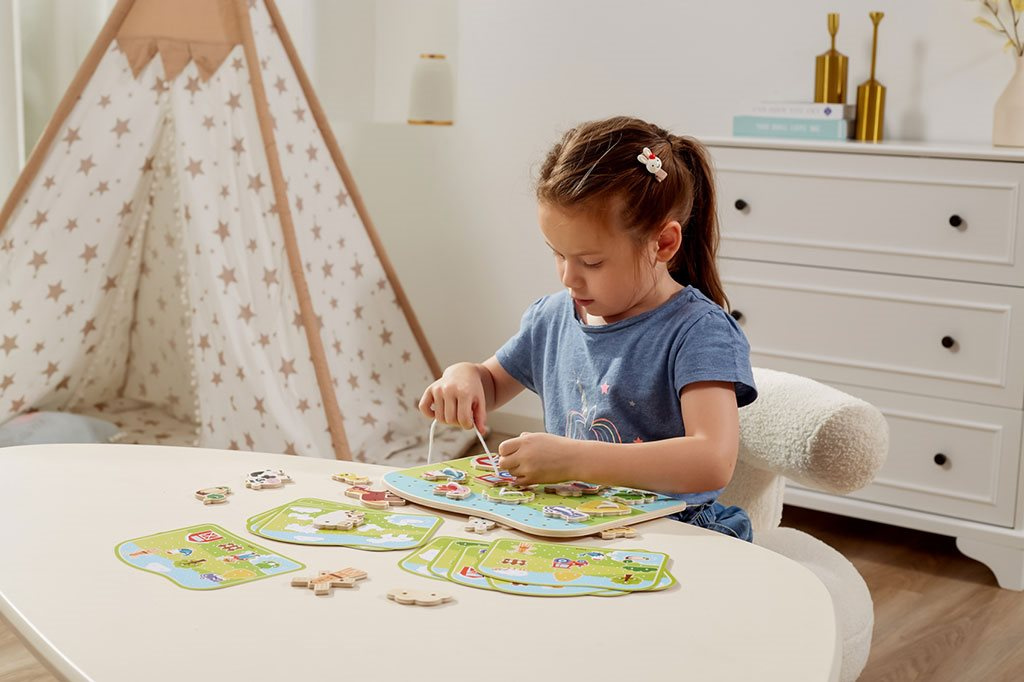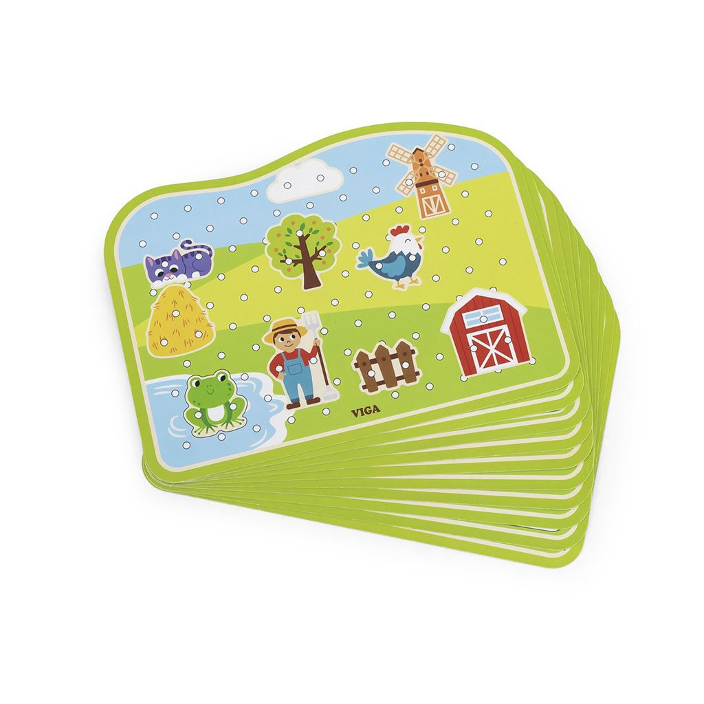 Šněrovací hra - farma od společnosti Viga je jednou z nejkrásnějších hraček, tento typ hry zlepšuje oční a motorickou koordinaci nebo prostorovou orientaci. Součástí hry je dřevěná základna s otvory a ilustrací farmy, 20 krásně malovaných destiček s vyobrazením hospodářských zvířat a okolní přírody a 10 kartiček, které ukazují různé způsoby navlékání doplňků na desku. Dítě přiřazuje a navléká destičky ke vzorům na kartičkách, které jsou střídavě umístěny na základně. Batolata tak mají možnost rozvíjet svou fantazii a mohou si z dostupných dílků sestavit i vlastní vyprávění.
