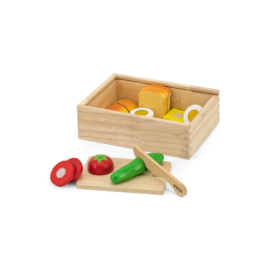 Sada na krájení - snídaně od společnosti Viga je ideální hračkou, která podněcuje dětskou představivost. Díky bezpečnému noži, který je vyroben ze dřeva, může dítě snadno "krájet" chléb, vajíčko nebo sýr. Další, výhodou je skutečnost, že všechny výrobky jsou spojeny suchým zipem pro nekonečnou zábavu.