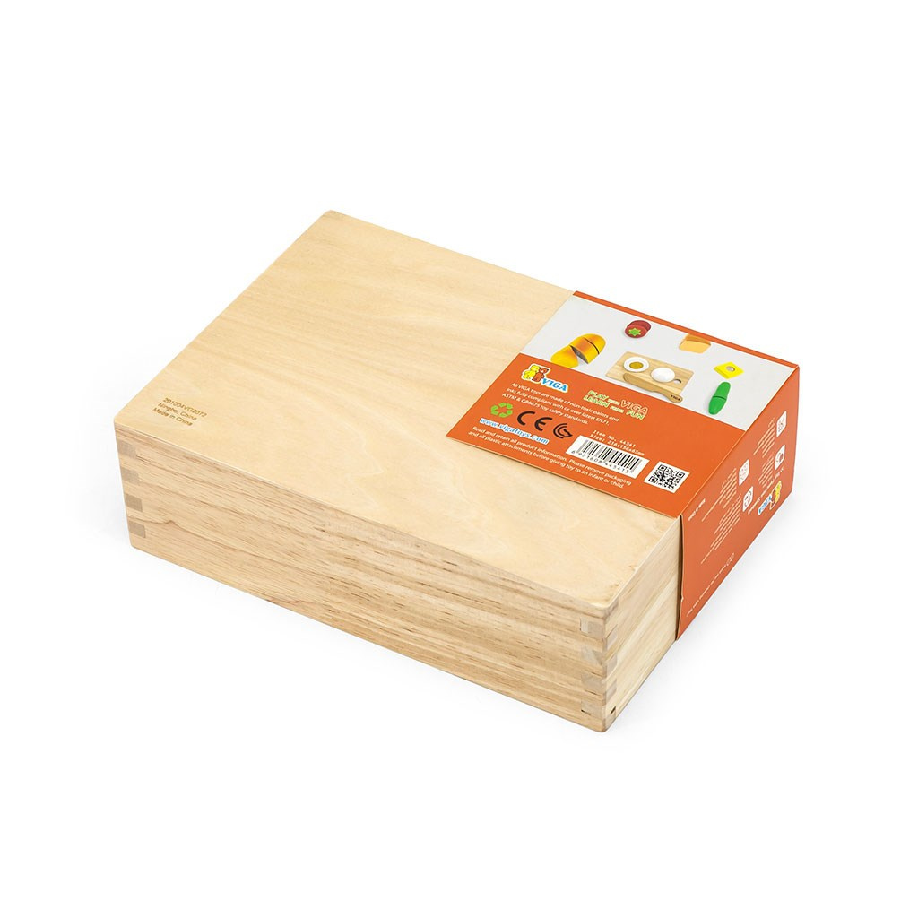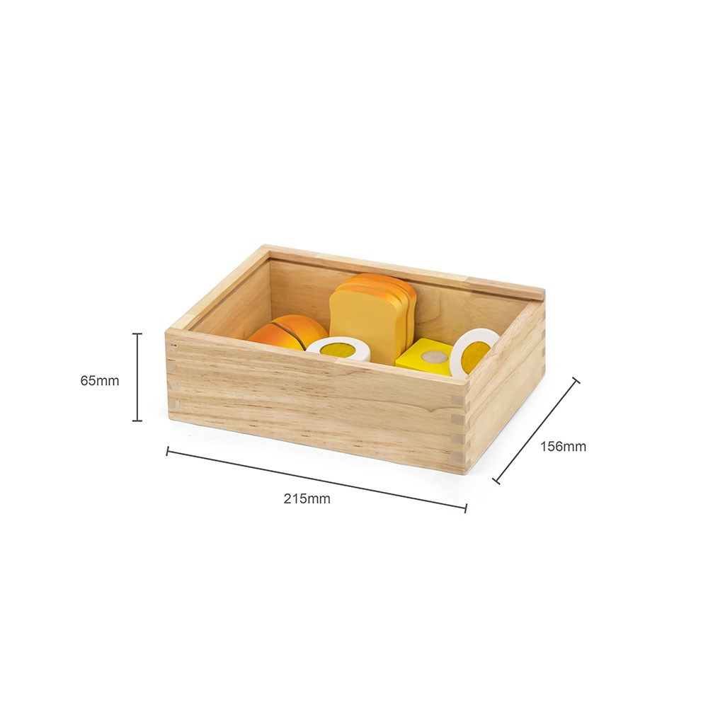 Sada na krájení - snídaně od společnosti Viga je ideální hračkou, která podněcuje dětskou představivost. Díky bezpečnému noži, který je vyroben ze dřeva, může dítě snadno "krájet" chléb, vajíčko nebo sýr. Další, výhodou je skutečnost, že všechny výrobky jsou spojeny suchým zipem pro nekonečnou zábavu.