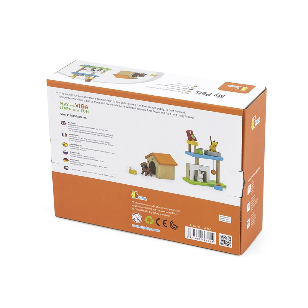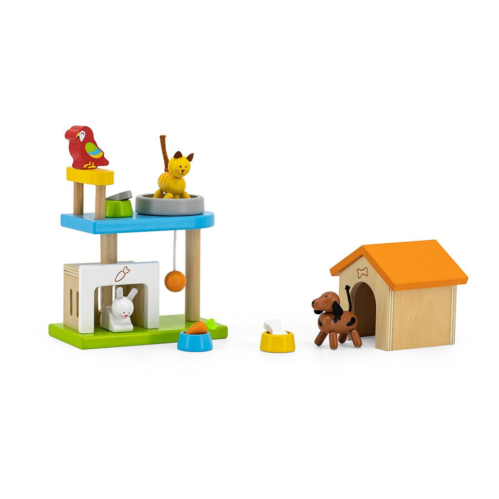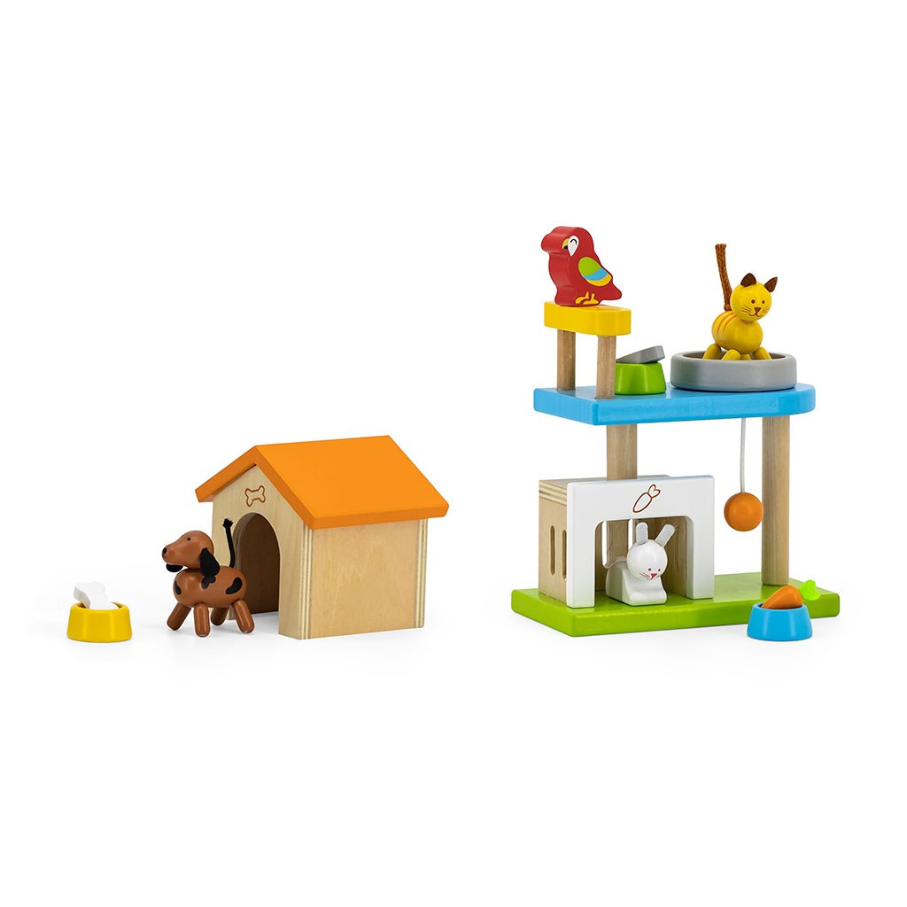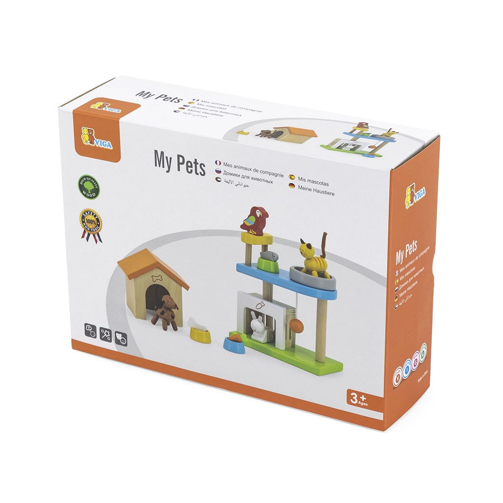 Sada se skládá ze 4 dřevěných figurek představujících domácí zvířata (pes, kočka, králík, papoušek), doplňků pro krmení (misky a jídlo) a spaní (bouda pro psa, domeček pro králíka, pelíšek pro kočku a hůl pro papouška).