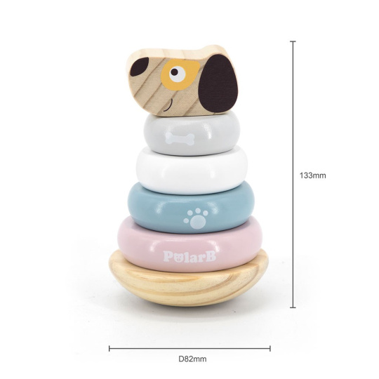 Pastelový pes je vyroben ze 6 disků-bloků různých velikostí a barev, včetně jednoho ve tvaru psí hlavy. V základně je kolíček pro umístění prvků věže. Tato hračka je ideální pro batolata, která začínají skládat kostky. Pyramida podporuje rozvoj koordinace ruka-oko, logického myšlení a navíc podporuje učení rozpoznávání barev.