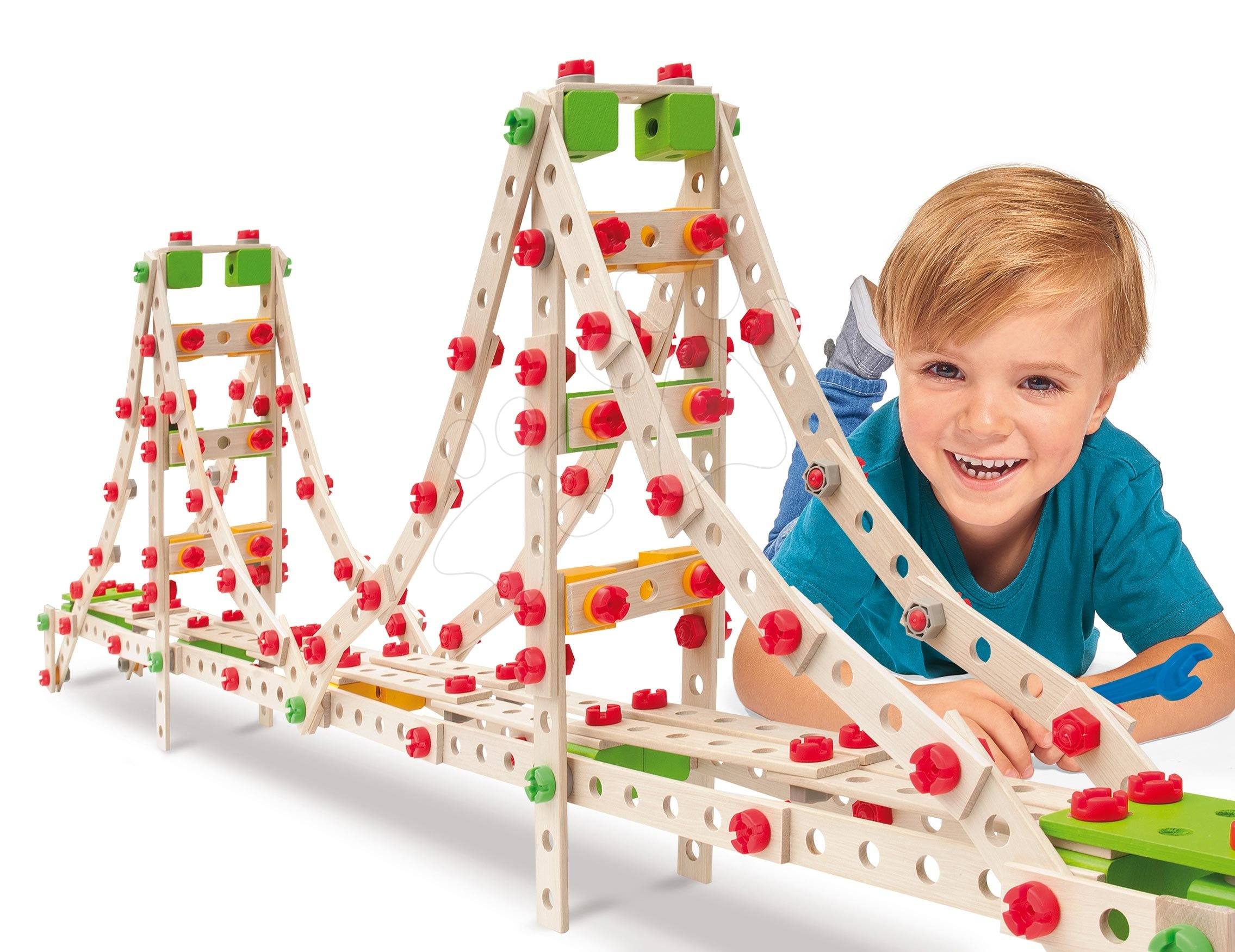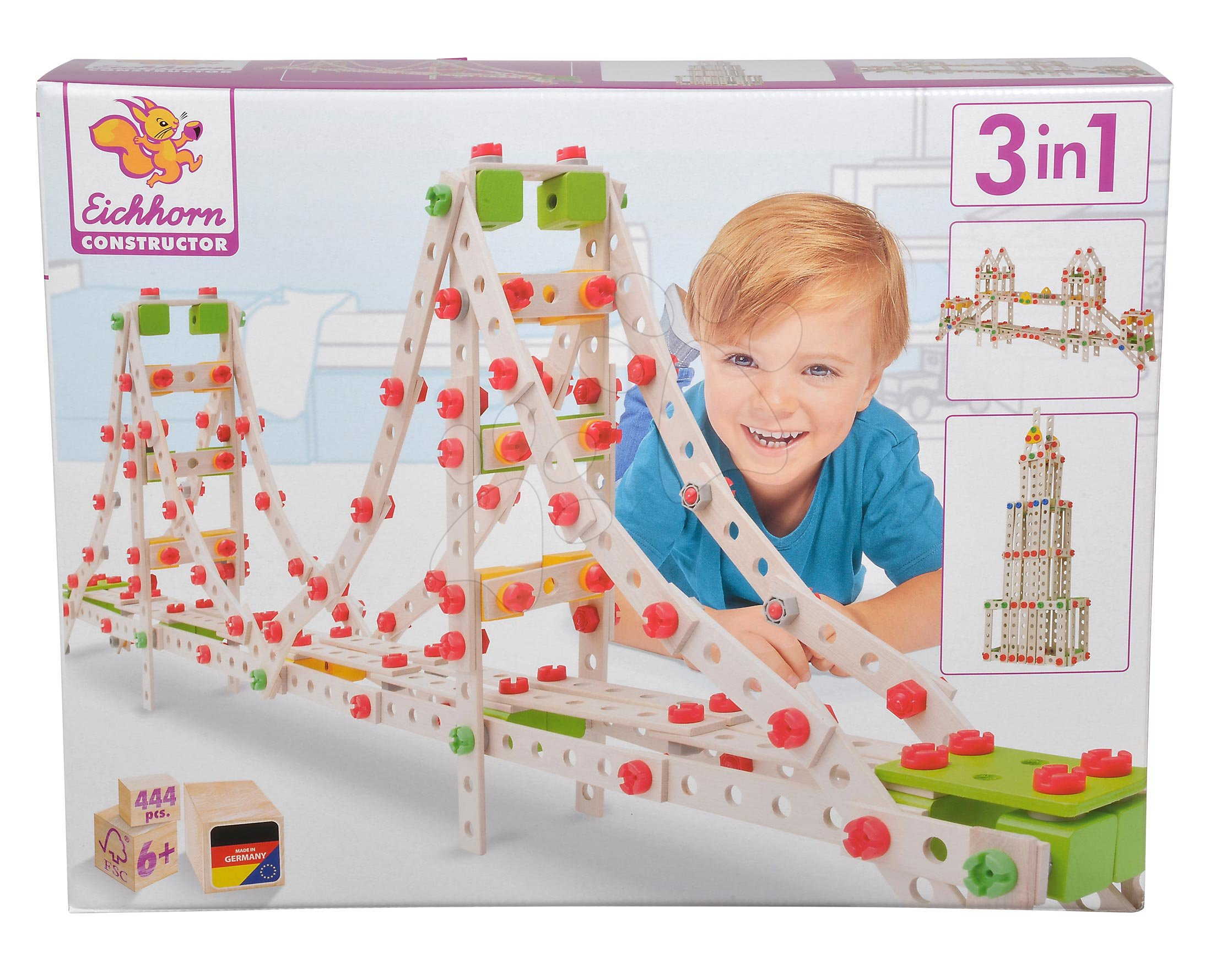 Dřevěná stavebnice 3v1 Constructor Golden Gate od německého výrobce Eichhorn potěší a zabaví všechny děti od 6 let. S bohatou 444dílnou soupravou si budou moci složit 3 perfektní modely – most Golden Gate Bridge, Tower Bridge a budovu Empire State Building. Hlavní dílky stavebnice s precizně zpracovanými detaily jsou vyrobeny z bukového dřeva, které je příjemné na dotek, dětem se s nimi snadno manipuluje. Malí inženýři a architekti si s touto stavebnicí přezkouší své schopnosti a dovednosti, rovněž si rozvíjejí i logické myšlení a technickou představivost. Při skládání slavných budov objevují stále nové herní možnosti, stavebnice jim poskytne zábavu na dlouhé roky.