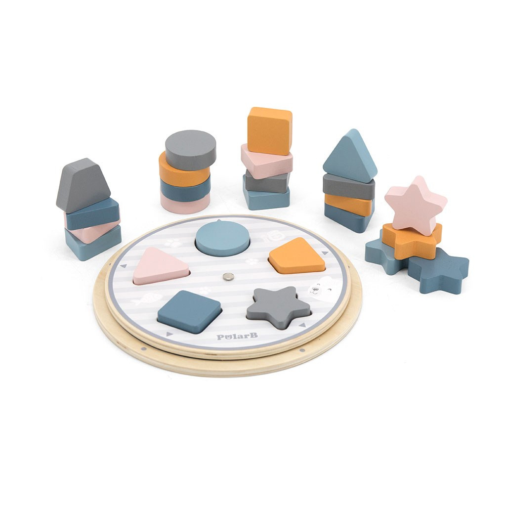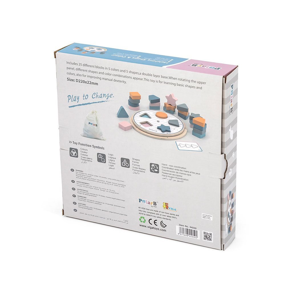 Představujeme dřevěnou hračku od společnosti VIGA - vkládanku tvarů a barev ze série POLAR BEAR. Hračka se skládá z pohyblivého disku, 25 kostek v různých kombinacích barev a tvarů a oboustranných kartiček s obrázky. Bloky lze umístit na disk přiřazením správných tvarů a barev nebo na karty uspořádáním obrázků na nich zobrazených.