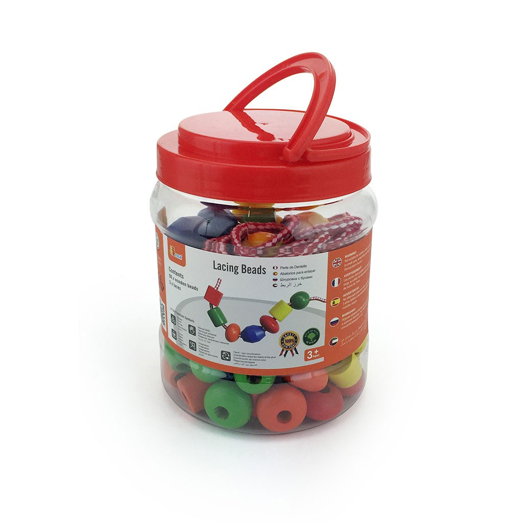 Balení obsahuje 90 kusů barevných korálků různých tvarů a 5 kusy navlékací šňůrky. Posouváním dřevěných korálků po šňůrce mohou děti vytvářet nekonečné vzory a kombinovat různé tvary a barvy.
