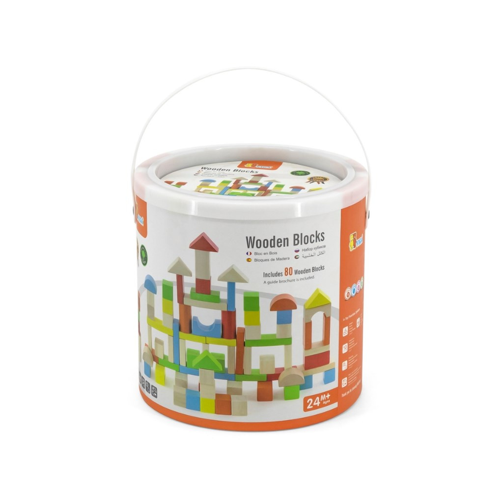 Krásné, barebné, dřevěné kostky v kyblíku Viga. Přináší 80 krásně barevných dílů i pro ty nejmenší stavitele. Stavebnice vydrží dlouhou dobu a dává vašemu dítěti mnoho let zajímavé a tvůrčí hry. Kostky mají různé tvary, velikosti, krásné barvy. Najdete zde tvary jako krychle, kvádr, trojuhleník, válec, obdélník, most, ad. Tento kyblík s kostkami tak slouží jako motorická pomůcka, která děti učí poznávat tvary a zacházet s kostkami. Hračka pomáhá zlepšit manuální zručnost a obratnost, učí dítě rozpoznat tvary a barvy, zapojuje a rozvíjí smysl pro pozorování. Hračka je vyrobena z lakovaného dřeva. Naší prioritou je bezpečnost a kvalita našich výrobků, a proto barvy použité na hračkách nejsou toxické a splňují bezpečnostní standardy (EN71 a ASTM). Pro děti od 2 let. Hračka je vhodná jako krásný dárek pro naše nejmenší.