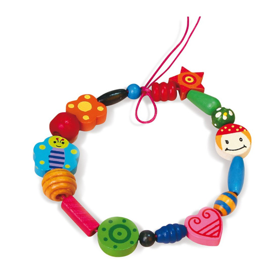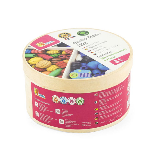 Kreativní sada dřevěných korálků Viga obsahuje 600 dřevěných korálků různých velikostí, tvarů a barev. Sada navíc obsahuje 8 šňůrek v různých barvách. Díky sadě si můžete vytvořit náramky nebo náhrdelníky.