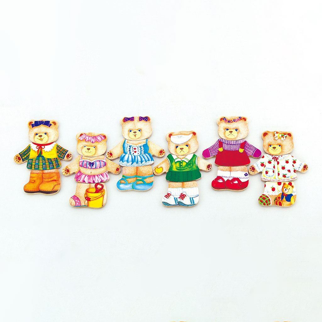 Sada obsahuje 18 dílků (6 x obličej medvídka - každý v jiné náladě, 6 x horní část těla a 6 x kraťasy), které lze libovolně sestavit na speciální podložce, která je zároveň víkem krabice.