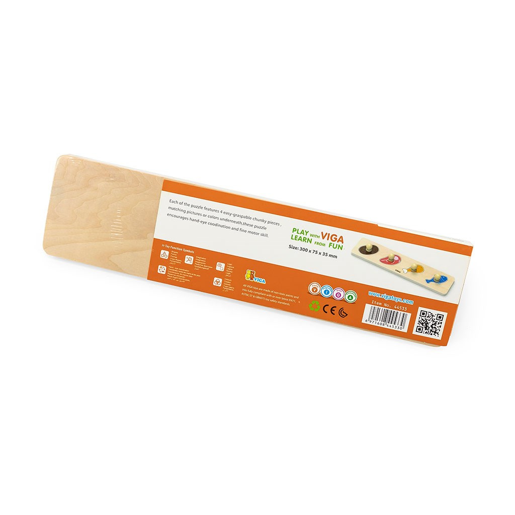 Krásné, barevné dětské dřevěné puzzle s úchyty Viga. Dětem se díky úchytům puzzle lépe drží v prstech a snáze se vkládájí do určených míst. Také pomáhá zlepšit manuální zručnost i obratnost a zároveň učí dítě rozpoznat tvary a barvy. Přispívá k rozvoji motoriky, zlepšuje koordinaci a pozorovací schopnosti dítěte. Balení obsahuje 4 dílky. Určeno pro děti od 12 měsíců. První puzzle pro Vaše malé děti, má velmi výrazné barvy, jednoduchý design a velké dílky. Naší prioritou je bezpečnost a kvalita našich výrobků, a proto barvy použité na hračkách nejsou toxické a splňují bezpečnostní standardy (EN71 a ASTM). Hračka je vhodná i jako krásný dárek pro naše nejmenší. Rozměr: 32x3x7,5 cm