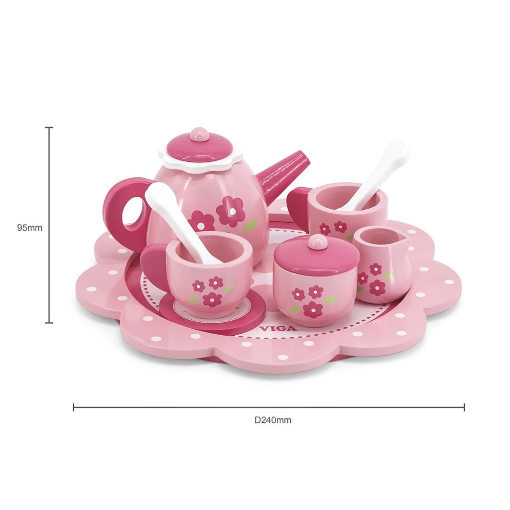 Dřevěná čajová souprava VIGA se skládá z 12 dílů - konvičky na čaj, konvičky na mléko, cukřenky, dvou šálků s podšálky a lžičkami a krásného podnosu.