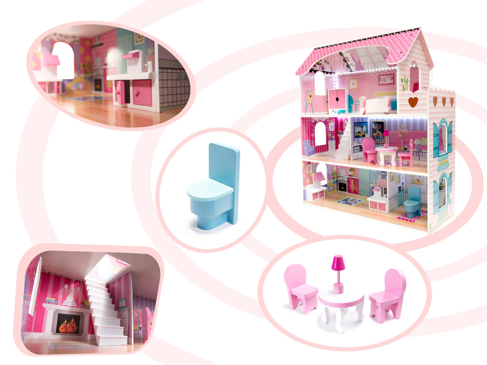 KIK Dřevěný domeček pro panenky 70 cm růžový + LED + nábytek