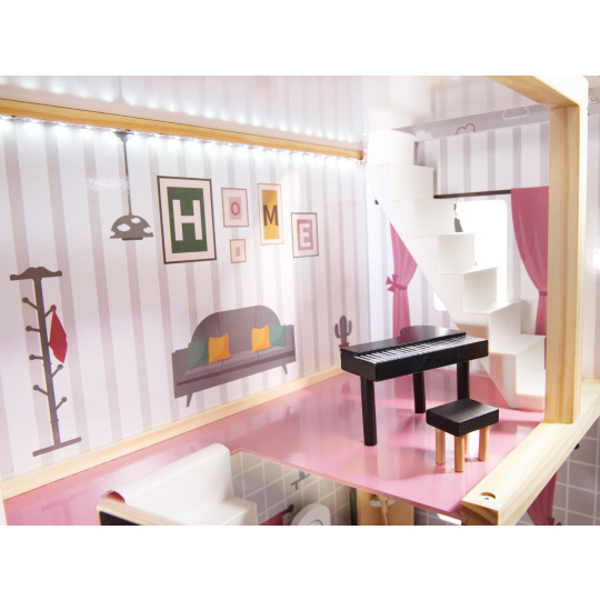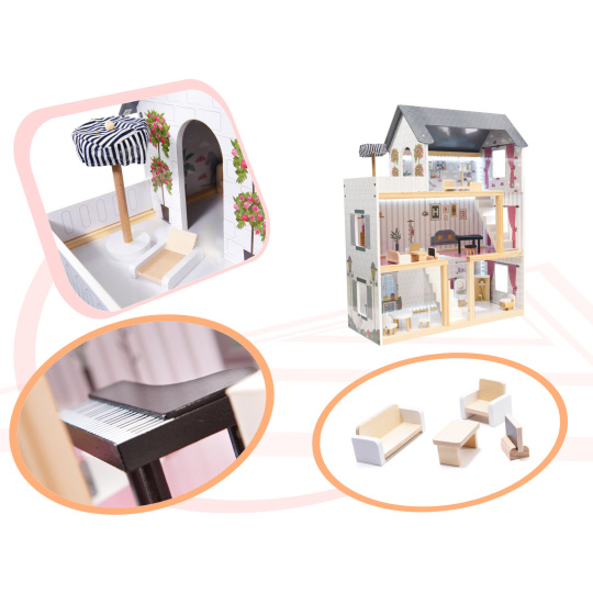 KIK Dřevěný domeček pro panenky šedý 78 cm + LED + nábytek