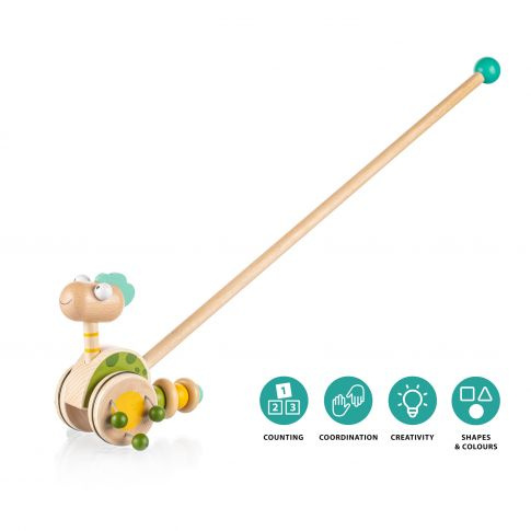 Jezdík na tyči je ideální hračkou pro děti, které začínají chodit. Zábavný dinosaurus na dlouhé tyči se při pohybu točí a díky dřevěným korálkům připevněných na kolečkách vydává zvuk, který dítě naláká k chůzi a zabaví na dlouhé hodiny.