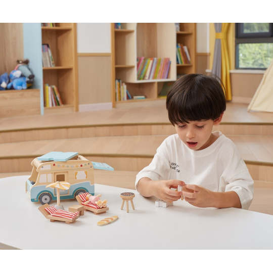 Dřevěný karavan je výjimečná hračka, která děti zavede do světa prázdninových dobrodružství a letních cest! Sada je inspirována bezstarostnými výjezdy k moři a díky precizním detailům a realistickým funkcím — jako jsou posuvné dveře, výsuvná střecha nebo střešní nosič na surfovací prkno — poskytuje dítěti hodiny zábavy plné kreativity. Karavan obsahuje bohaté příslušenství: dvě panenky, pejska, lehátka s polštářky, slunečník, gril, dokonce surfovací prkno, což umožňuje hrát všelijaké scénáře. Děti tak mohou ztvárňovat role týkající se cestování, odpočinku na pláži nebo organizování pikniku.