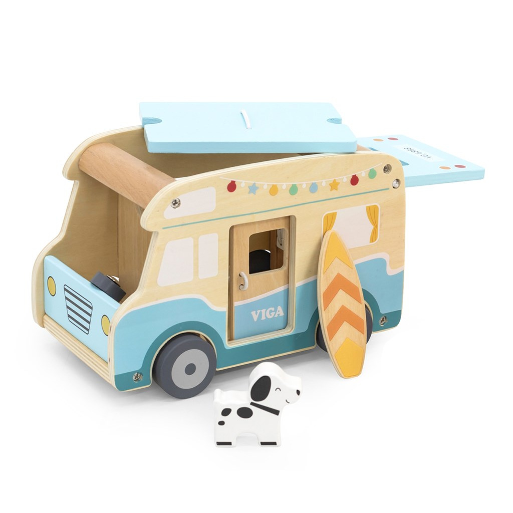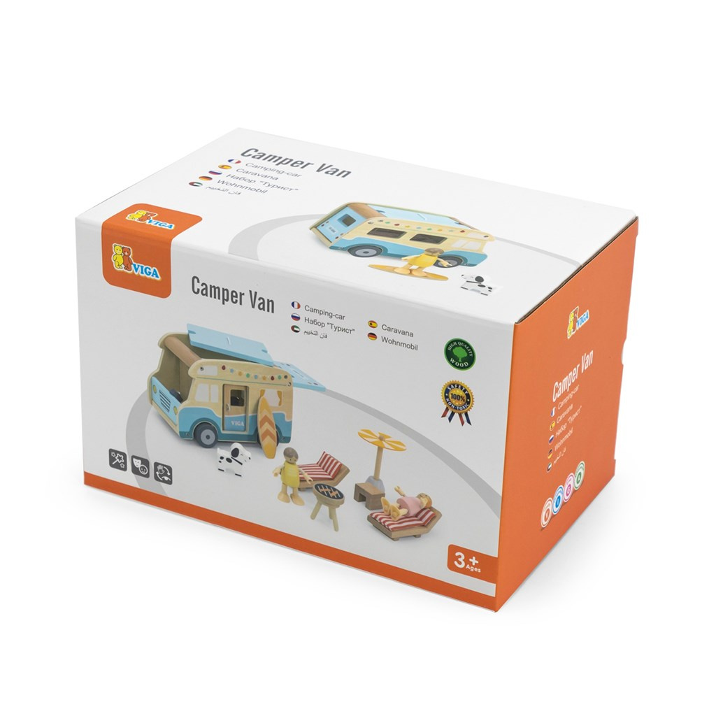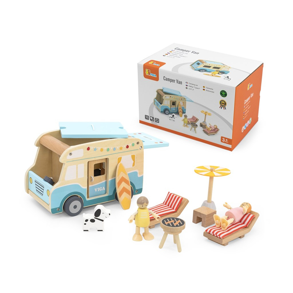 Dřevěný karavan je výjimečná hračka, která děti zavede do světa prázdninových dobrodružství a letních cest! Sada je inspirována bezstarostnými výjezdy k moři a díky precizním detailům a realistickým funkcím — jako jsou posuvné dveře, výsuvná střecha nebo střešní nosič na surfovací prkno — poskytuje dítěti hodiny zábavy plné kreativity. Karavan obsahuje bohaté příslušenství: dvě panenky, pejska, lehátka s polštářky, slunečník, gril, dokonce surfovací prkno, což umožňuje hrát všelijaké scénáře. Děti tak mohou ztvárňovat role týkající se cestování, odpočinku na pláži nebo organizování pikniku.
