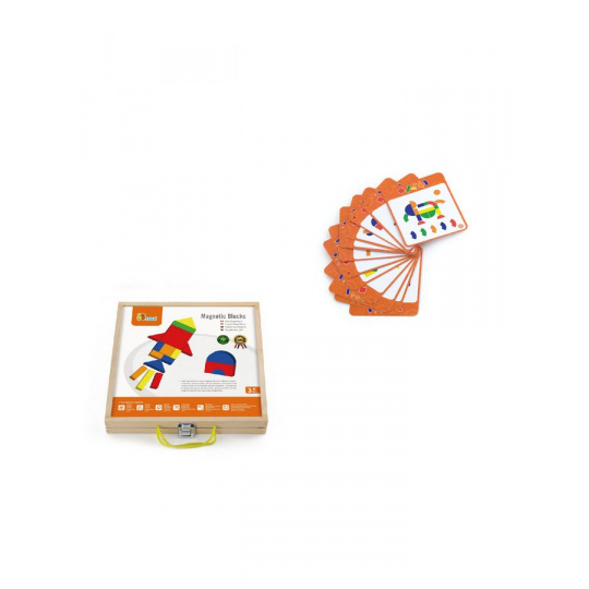 Kufr s magnetickými kostkami Viga. Dřevěný kufr obsahuje 42 kostek a 12 karet s 24 kombinacemi, do kterých je možné umístit kostky. Dítě může tvořit na základě šablony, nebo vytvořit vlastní kombinace. Všechny jsou vyrobeny z vysoce kvalitních materiálů. Magnetické a barevné kostky jsou v různých tvarech, což umožní dítěti vytvořit nové postavy. Hračka je vyrobena z lakovaného dřeva. Naší prioritou je bezpečnost a kvalita našich výrobků, a proto barvy použité na hračkách nejsou toxické a splňují bezpečnostní standardy (EN71 a ASTM). Pro děti od 36 měsíců.