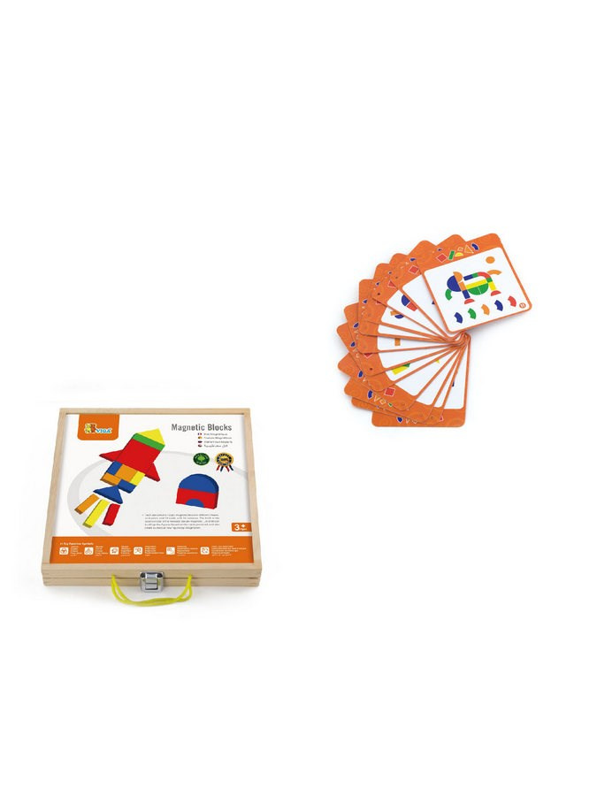 Kufr s magnetickými kostkami Viga. Dřevěný kufr obsahuje 42 kostek a 12 karet s 24 kombinacemi, do kterých je možné umístit kostky. Dítě může tvořit na základě šablony, nebo vytvořit vlastní kombinace. Všechny jsou vyrobeny z vysoce kvalitních materiálů. Magnetické a barevné kostky jsou v různých tvarech, což umožní dítěti vytvořit nové postavy. Hračka je vyrobena z lakovaného dřeva. Naší prioritou je bezpečnost a kvalita našich výrobků, a proto barvy použité na hračkách nejsou toxické a splňují bezpečnostní standardy (EN71 a ASTM). Pro děti od 36 měsíců.