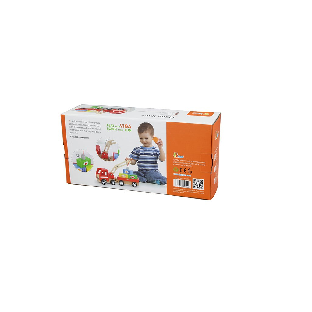 Sada se skládá z auta s otočným jeřábem a magnetem, odnímatelného přívěsu a čtyř tematických nádob (ovoce, chléb, zelenina, ryby) s magnety, které umožní vašemu batoleti nakládat a vykládat dopravní prostředky. Celá sada je vyrobena z bukového dřeva natřeného nezávadnými barvami .
