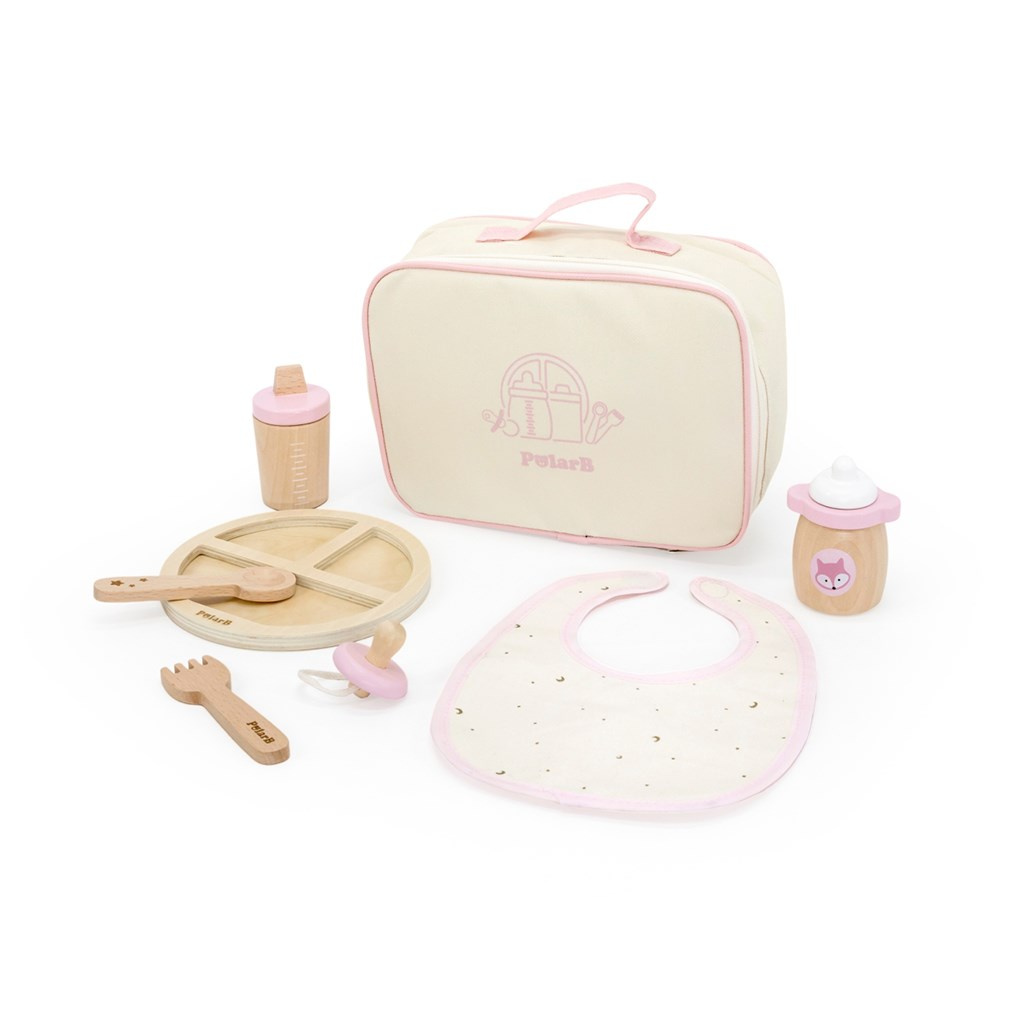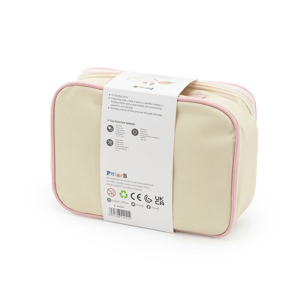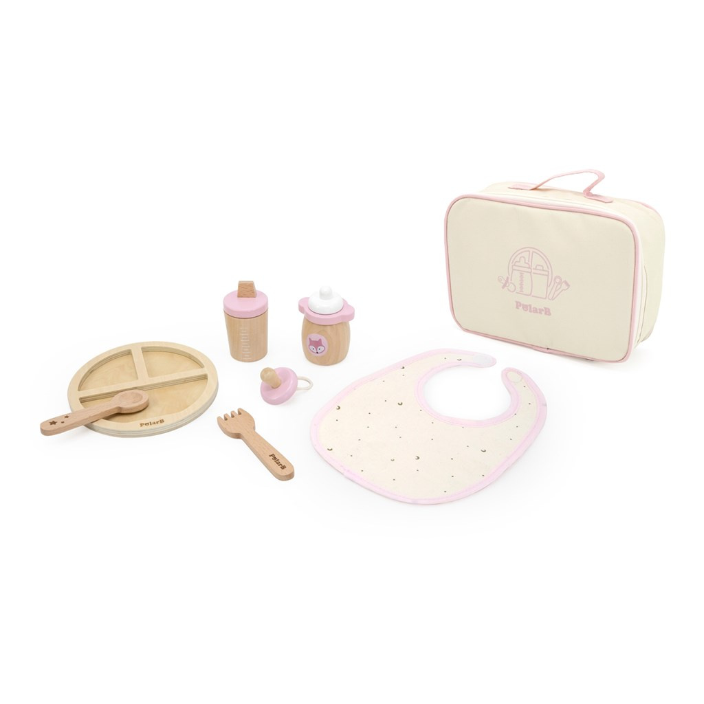 V sadě najdete: bryndáček, vidličku, lžičku, dudlík, talířek, láhev na krmení a láhev s vodou – vše přehledně zabaleno v látkovém organizéru.