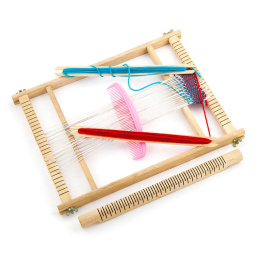 Dřevěný ruční tkalcovský stav, na kterém si dítě může vytvořit vlastní látky.