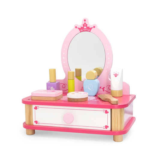 Tato dokonalá toaletka, zdobená roztomilými kresbami srdíček a květin, je přímo vysněným doplňkem pro každou malou dámu. S toaletkou může vytvářet úžasné účesy, make-up nebo hrát si na přeměny. Při hře si dítě rozvíjí svůj smysl pro estetiku. Dřevěný toaletní stolek se zrcadlem je skvělou hračkou pro děti, které milují kreativní hry a rozvíjení fantazie.