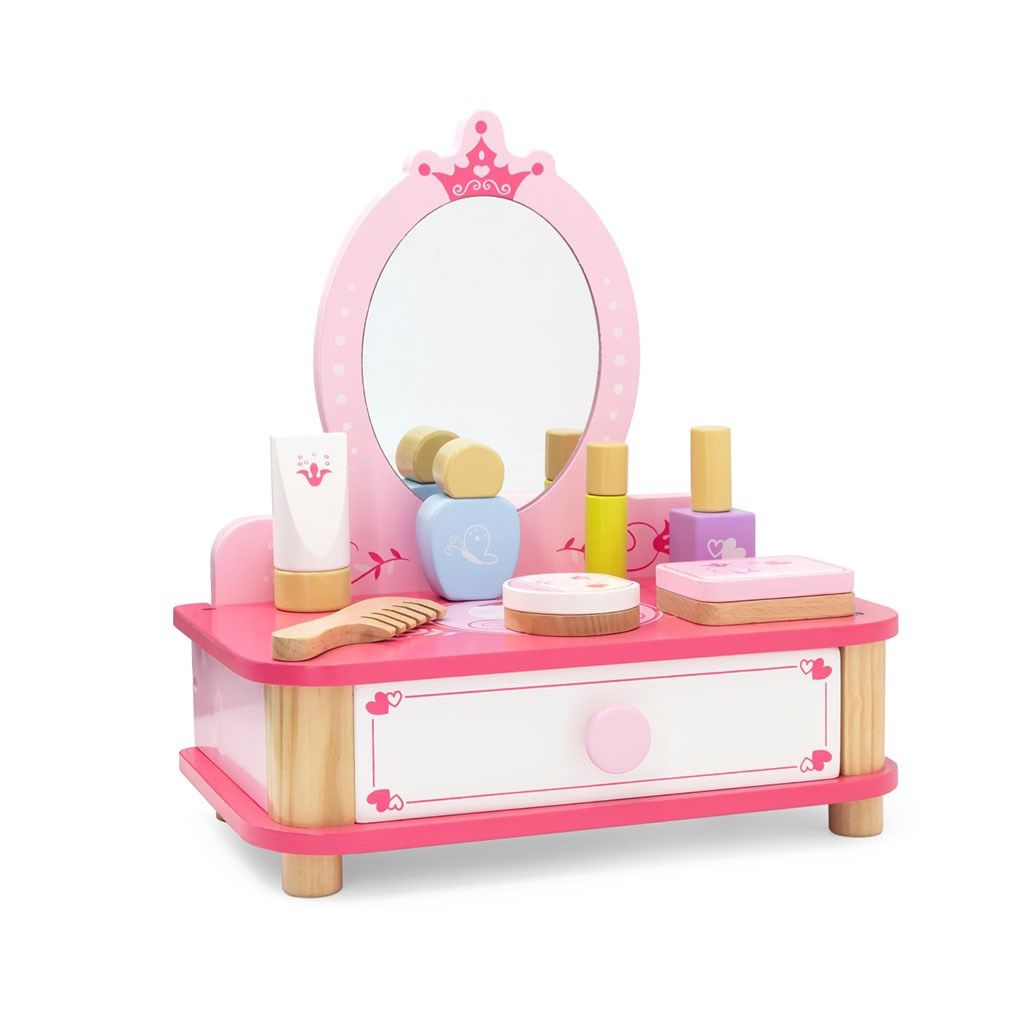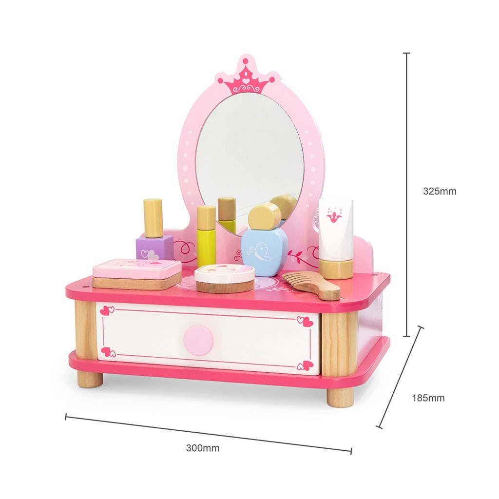 Tato dokonalá toaletka, zdobená roztomilými kresbami srdíček a květin, je přímo vysněným doplňkem pro každou malou dámu. S toaletkou může vytvářet úžasné účesy, make-up nebo hrát si na přeměny. Při hře si dítě rozvíjí svůj smysl pro estetiku. Dřevěný toaletní stolek se zrcadlem je skvělou hračkou pro děti, které milují kreativní hry a rozvíjení fantazie.
