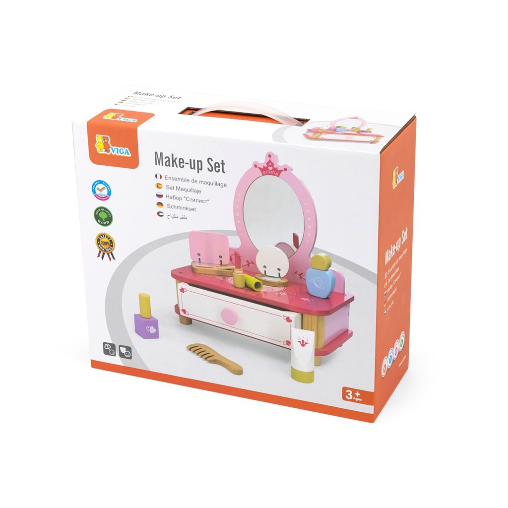 Každá malá holčička ráda napodobuje svou maminku, a tento krásný dřevěný toaletní stolek se zrcadlem a kosmetickými doplňky bude skvělým doplňkem pro její hrátky. Toaletní stolek obsahuje vše, co malá vizážistka potřebuje v domácím salónu. Vysouvací šuplík skvěle poslouží na všechny potřebné doplňky, šperky nebo jiné poklady. Udělejte svému dítěti nádherný dárek, který jej vezme na cestu do světa fantazie.