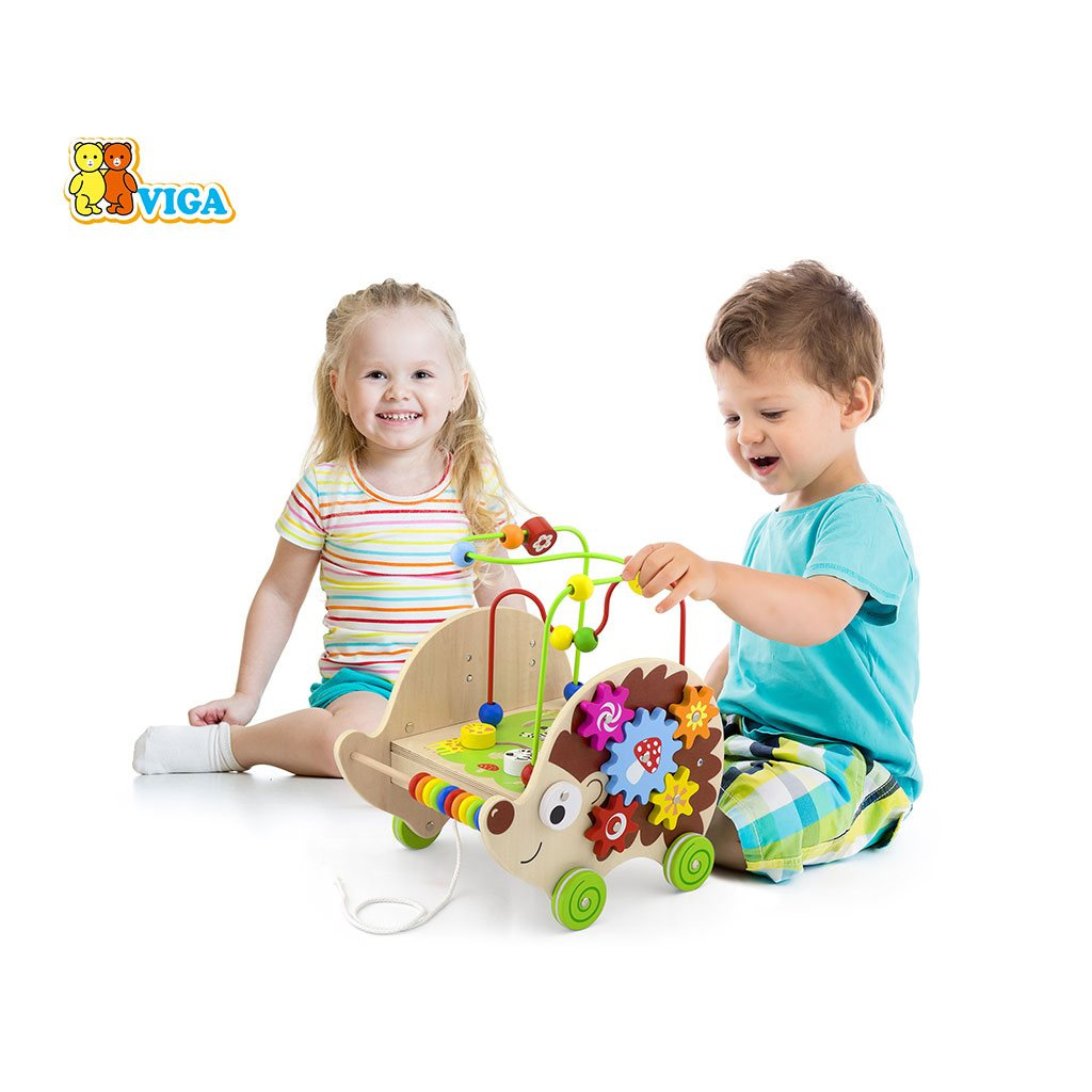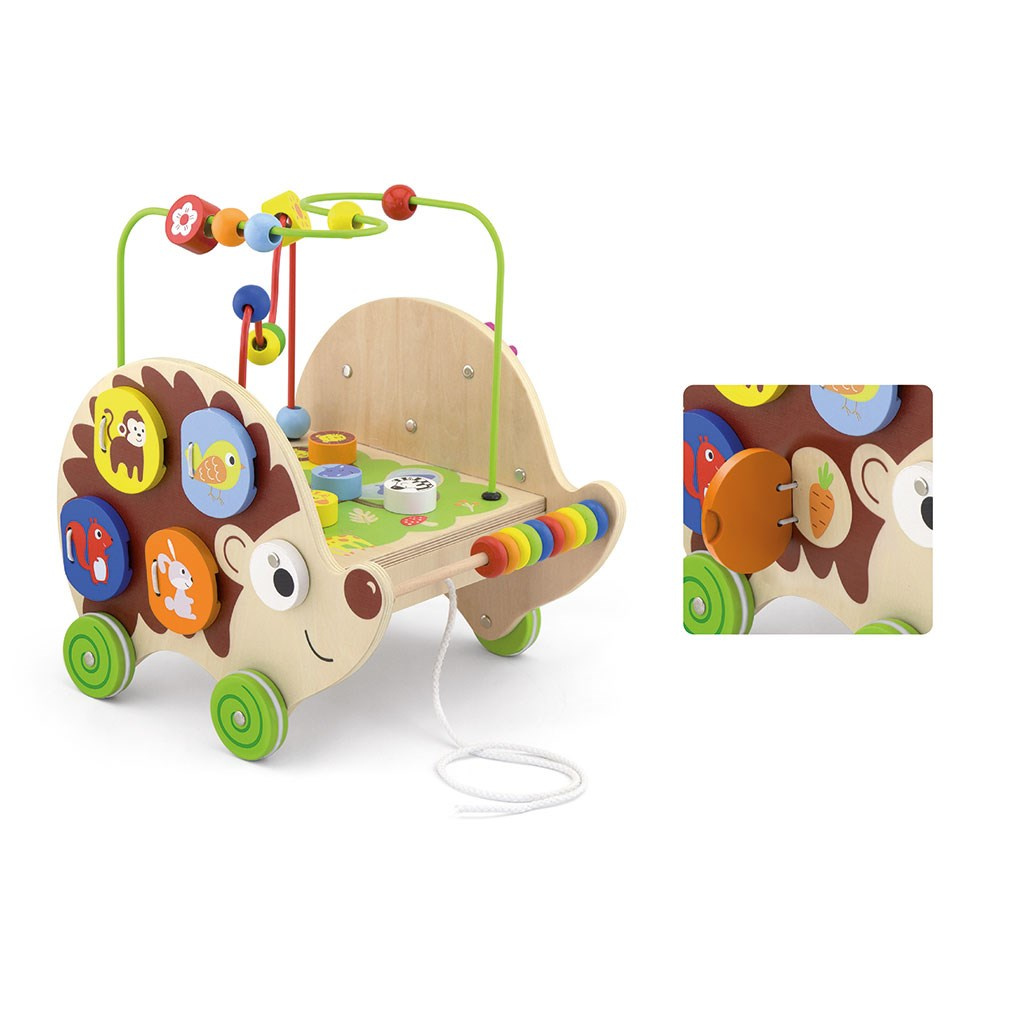 Prostorový labyrint v podobě roztomilého ježka je multifunkční tahací hračka. Ježek poskytne vašemu dítěti hodiny plné zábavných atrakcí. První jsou korálky přímo u ježkova nosu, které lze použít jako počítadlo. Další atrakcí jsou barevné korálky různých tvarů a barev, které lze volně posouvat po kovových tyčích. V dolní části prostorového bludiště se nachází druhá dráha bludiště, kde má batole za úkol správně přiřadit hlavy zvířátek k obrázku, který je třeba najít. Na zadní straně Ježka jsou další atrakce: na jedné straně jsou ozubená kolečka, která přinesou spoustu zábavy každému dítěti; zatímco na druhé straně jsou Ježkovi kamarádi. Pod jejich obrázky se nacházejí pamlsky příslušného zvířátka. Ježek se s vaším dítětem rád vydá na cestu - má šňůrku a kolečka s protiskluzovým uzávěrem.