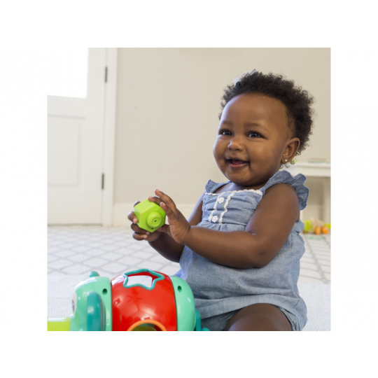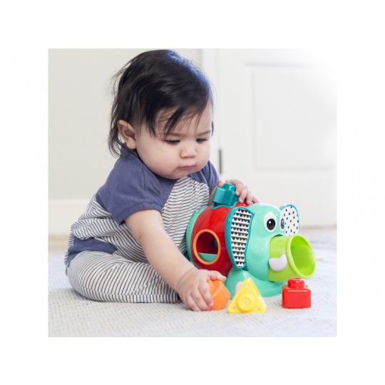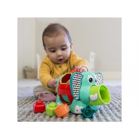 Roztomilý slon s různobarevnými vkládacími tvary. Pohyblivé uši a chobot i otočné tělo slona budou lákat dítě ke zkoumání. Hračka pomůže vašemu dítěti naučit se poznávat barvy i tvary a rozvíjet jednotlivé smysly a motorické dovednosti. Vhodné pro děti od 12 měsíců.