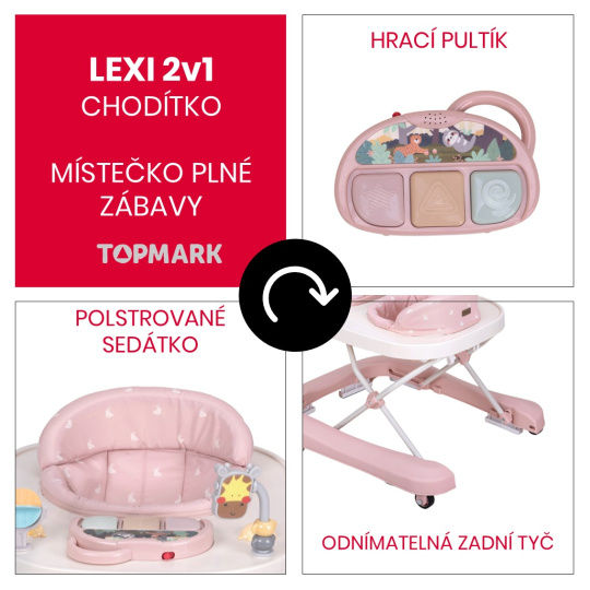 - Chodítko lze po vyjmutí zadní tyče přeměnit v chodítko aktivity pro první krůčky, chodítko je možné tlačit.