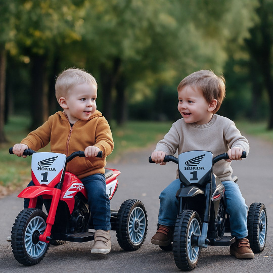 Po zapnutí se ozve zvuk motoru a po sešlápnutí plynového pedálu se motorka rozjede. Velká kola s terénním vzorkem zajišťují stabilitu při jízdě venku a tvarované sedadlo zajišťuje pohodlí a bezpečnost nejmenších uživatelů. Ocelové osy kol zaručují stabilitu a odolnost vozidla. Součástí je také klakson, díky kterému bude hraní ještě zábavnější.