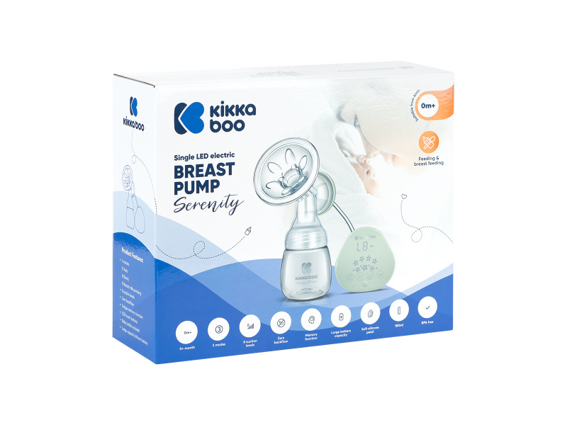Elektrická odsávačka mateřského mléka KikkaBoo Serenity je jednoduchá odsávačka pro každodenní použití. Nabízí účinné a jemné odsávání a snadnou obsluhu s pomocí LED dotykového displeje. tři režimy: automatický, odsávací a bionický 8 úrovní síly odsávání měkká silikonová přísavka funkce paměti nastavení pro rychlé použití systém nulového zpětného toku zajistí, že mléko nemůže téci zpět do hlavní jednotky dobíjecí lithiová baterie s velkou kapacitou 1100 mAh lahvička s kapacitou 180 ml Rozměry: 20 x 12 x 6,5 cm Hmotnost: 420 g