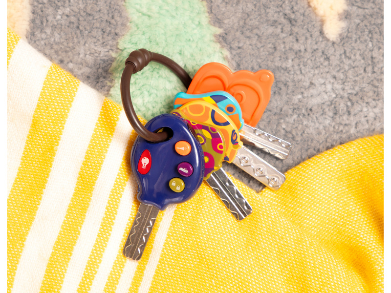Čtyři klíčky jako od opravdového auta na kroužku s přívěskem. Jeden z klíčků má ovladač se třemi různými zvuky a světýlkem. Odolný materiál bezpečný pro zkoumání rukou i ústy. Baterie 3× AG13 (LR44) jsou součástí. Vhodné od 10 měsíců.