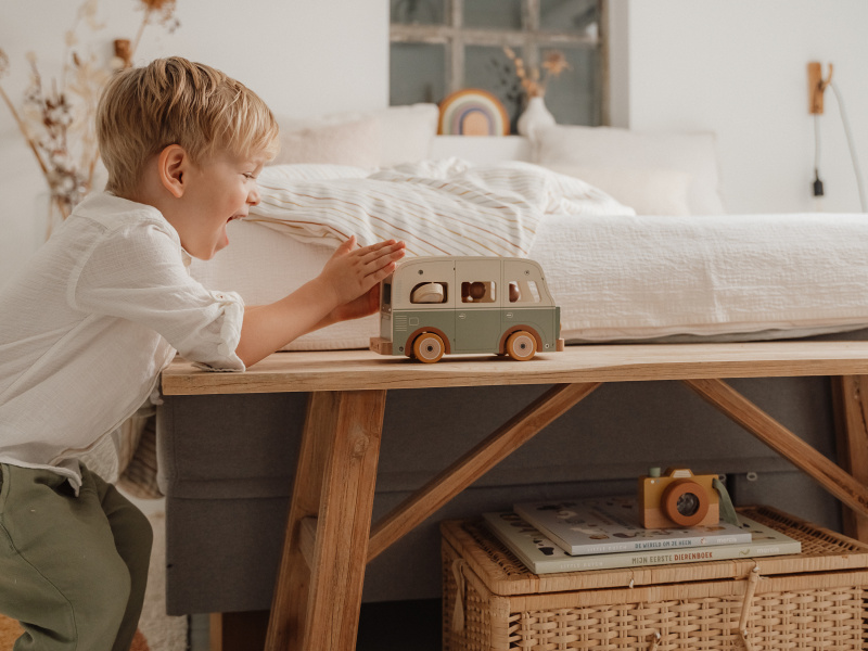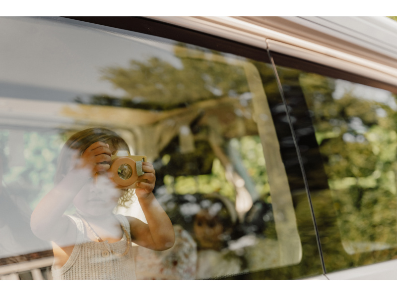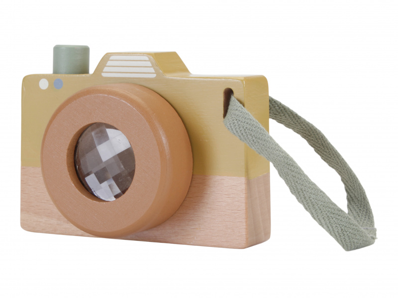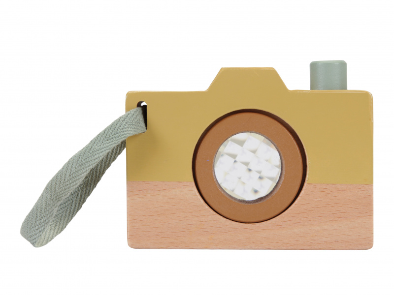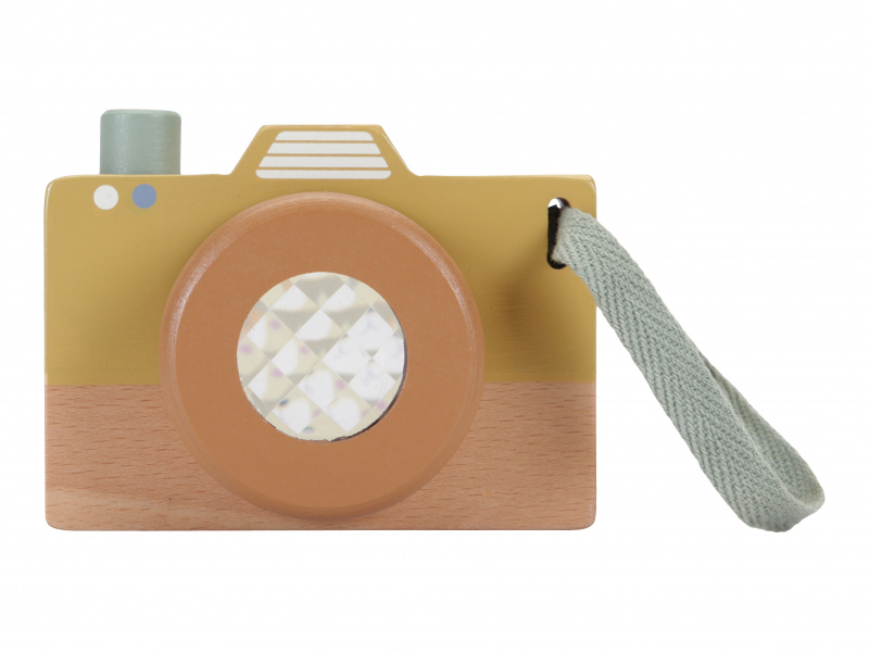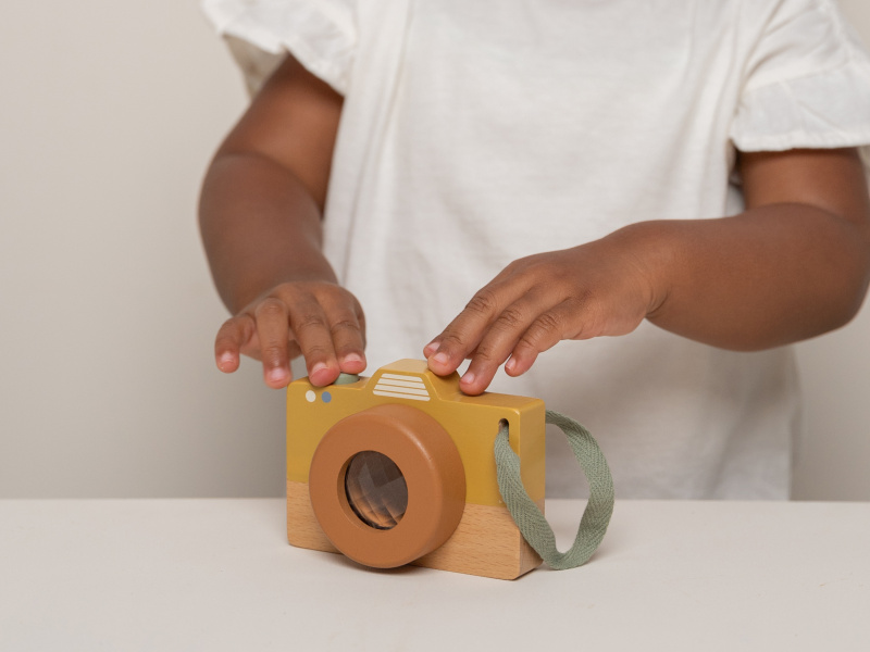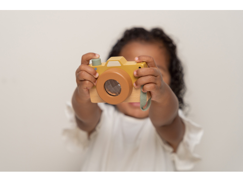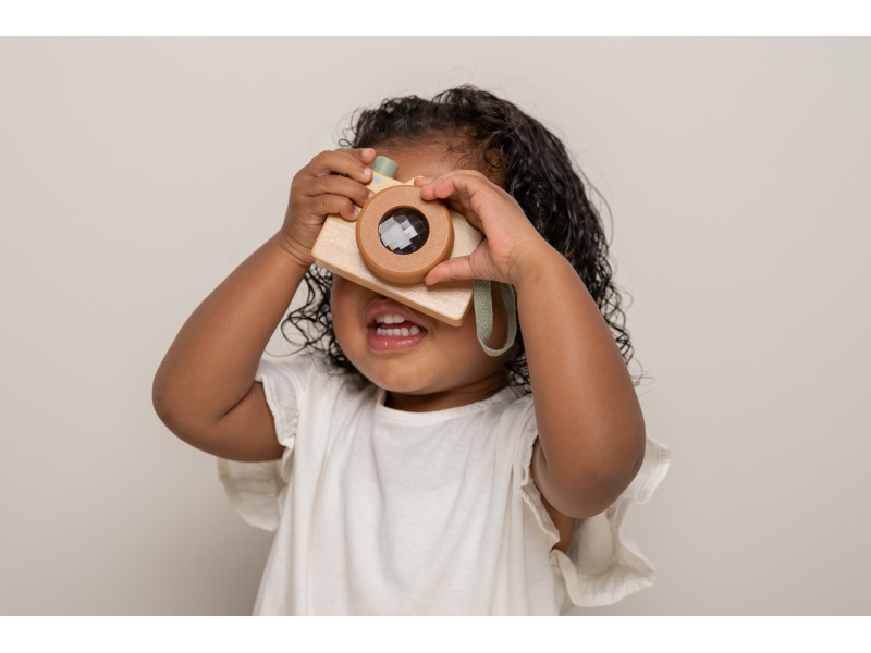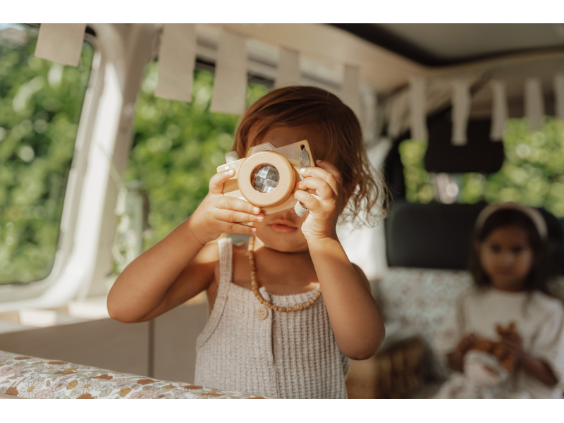 Dřevěný fotoaparát s poutkem na zápěstí si vaše dítě může snadno nosit všude s sebou - na procházku, do zoo i k babičce. Pohled na svět v přes objektiv v podobě kaleidoskopu bude vždy barevný a zábavný! Mačkací spoušť umožňuje malému fotografovi zažívat pocit skutečného focení. Rozměry: 4,5 x 10 x 7,5 cm Vhodné pro děti od 2 let.