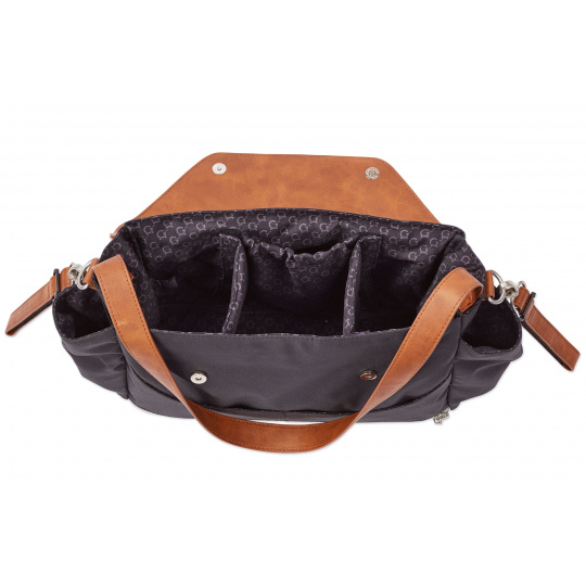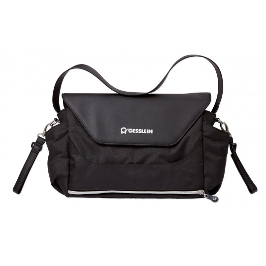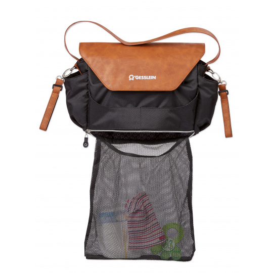 Postraním pásky pro připevnění na rukojeť kočárku, stejně tak jako praktický popruh přes rameno.