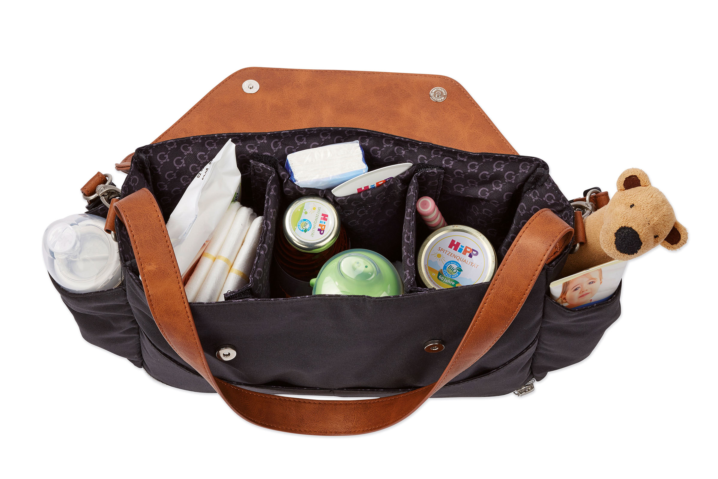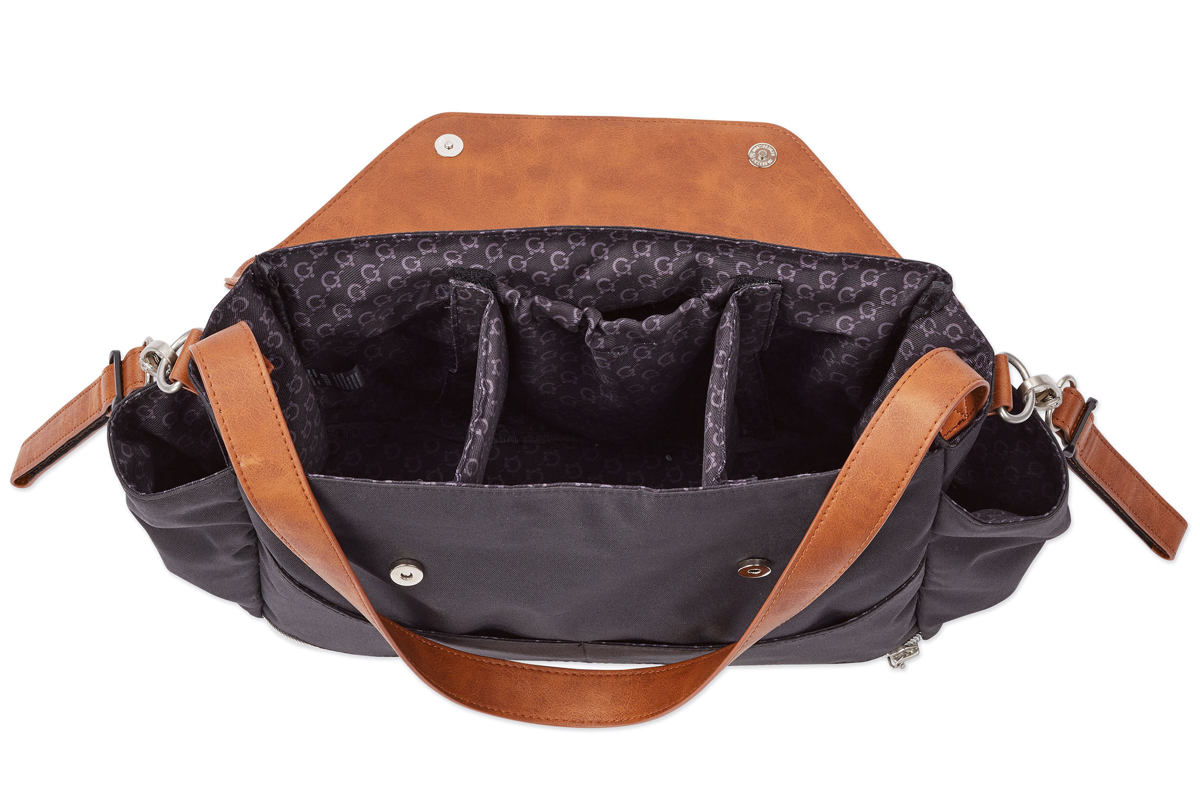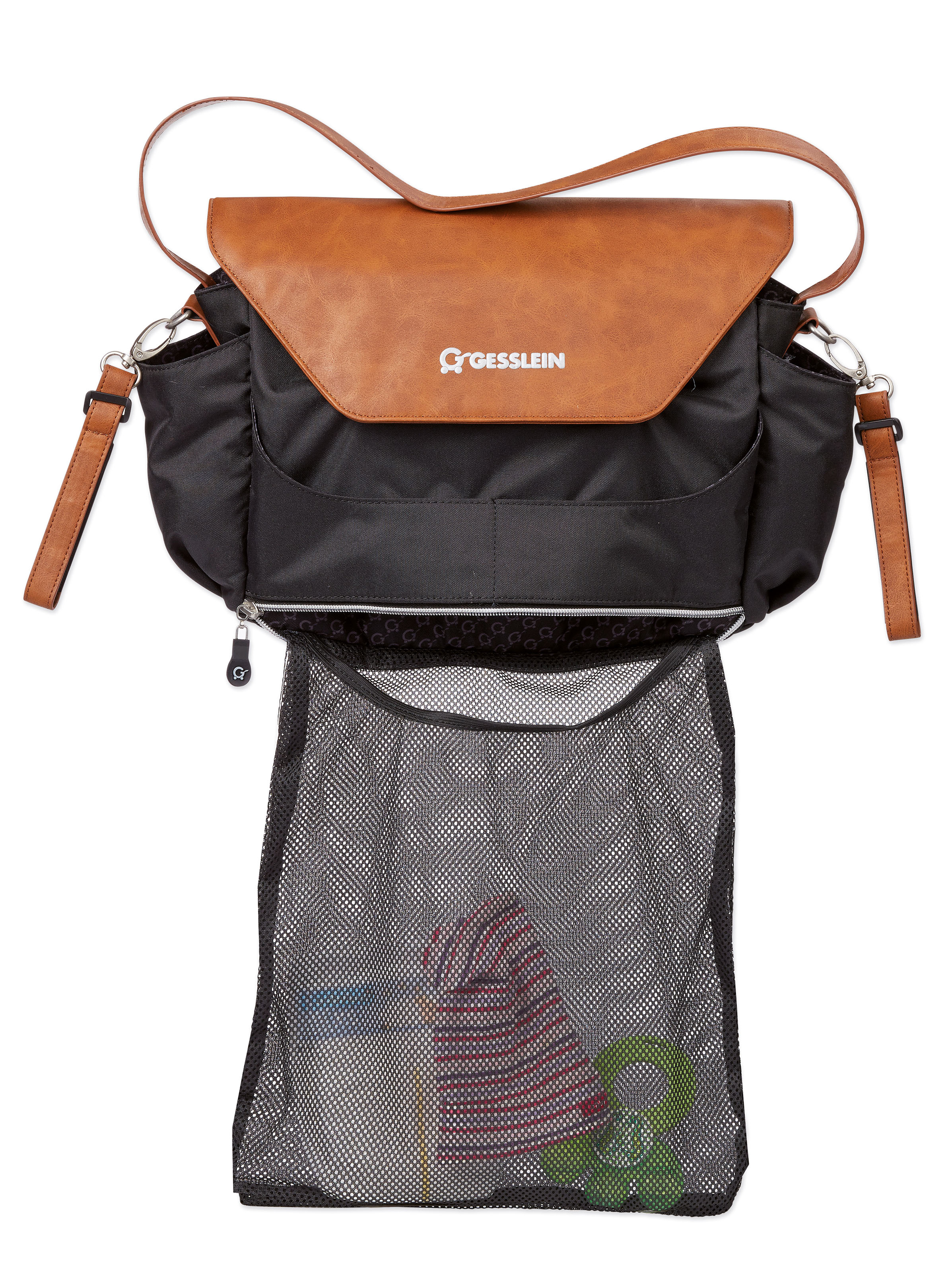 Postraním pásky pro připevnění na rukojeť kočárku, stejně tak jako praktický popruh přes rameno.