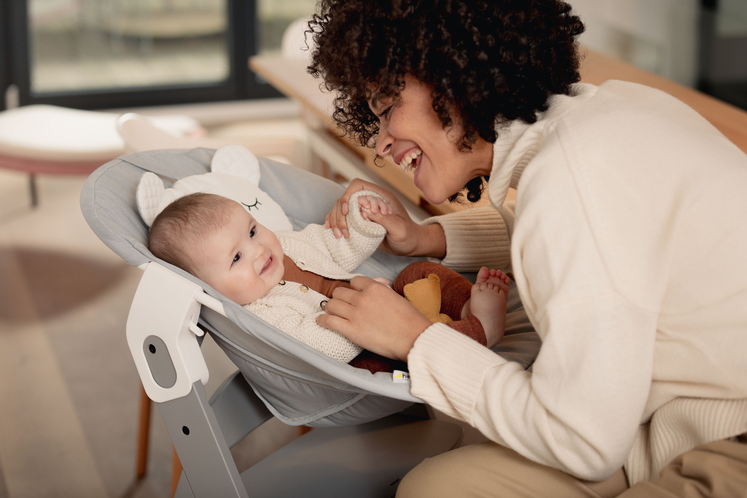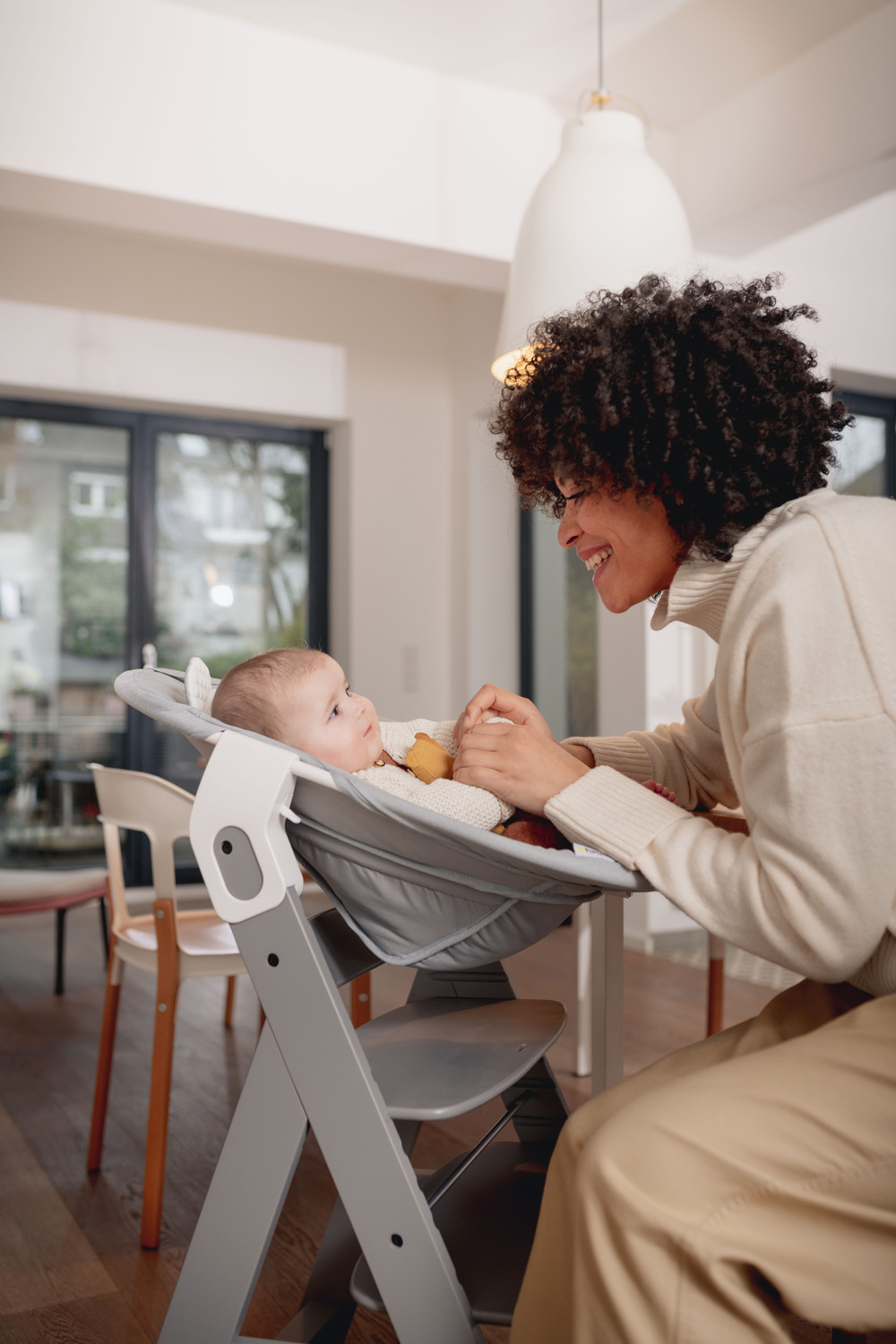 VE STEJNÉ ÚROVNI OČÍ OD PRVNÍHO DNE // Ať už si dáváte pohodovou večeři nebo rychlé cappuccino, vysoká židlička Alpha+ s nástavcem pro novorozeňátka zajistí, že vám vaše maličké bude vždy na blízku a ve stejné úrovni očí.