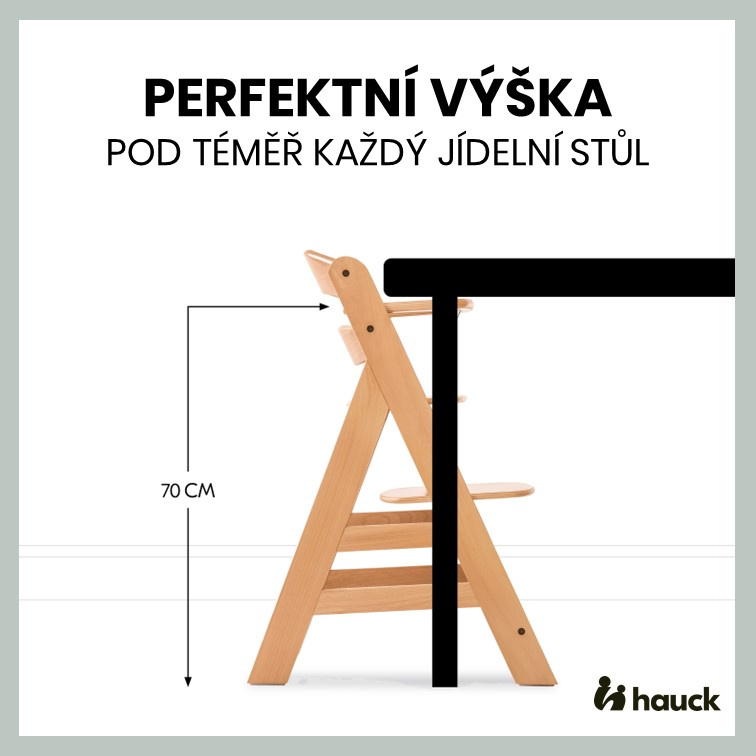 PERFEKTNĚ SE VEJDE POD STŮL // S výškou 70 cm včetně ochranného oblouku se jídelní židlička Alpha+ snadno vejde pod téměř každý stůl. Díky tomu se bude vaše dítě vždy cítit součástí dění, ať už v čase jídla, při hraní nebo kreslení.